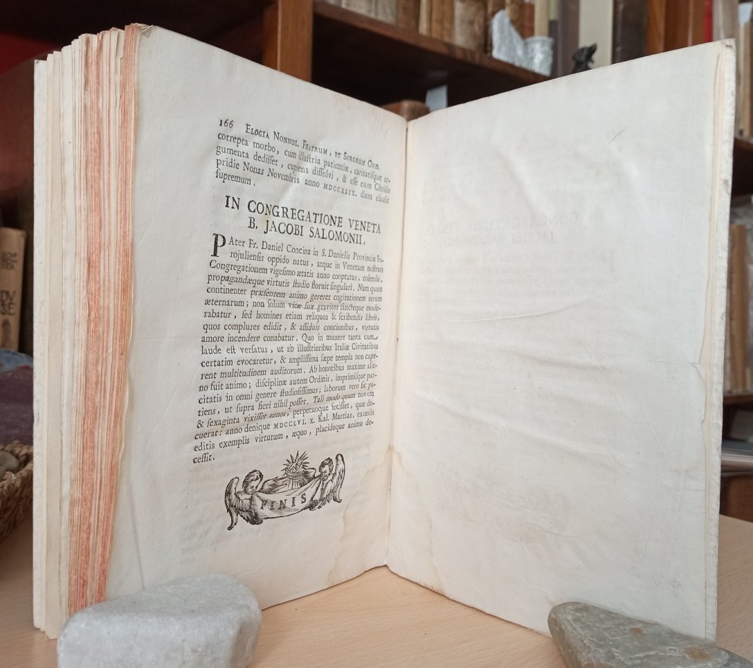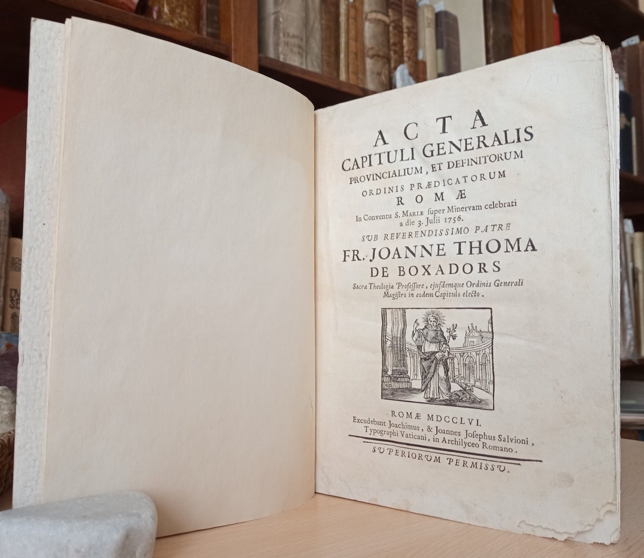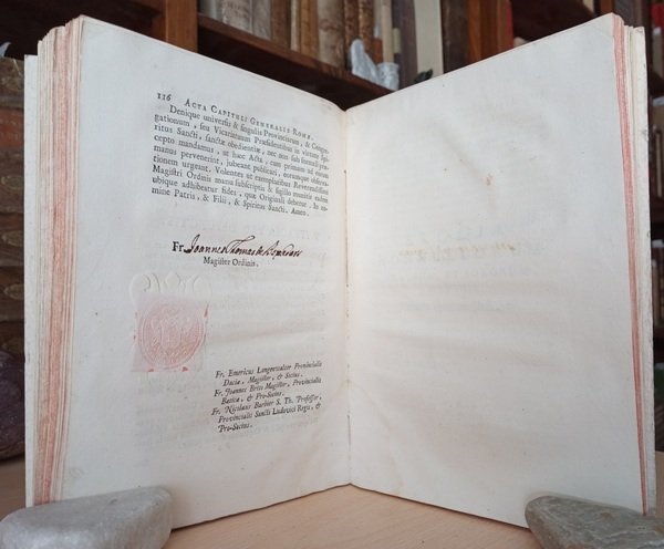 Volume in 4, brossura muta semirigida, taglio rosso, sguardie, frontespizio con bella vignetta xilografica (all'interno di uno sfondo architettonico, S. Domenico a figura intera, con la mano destra indica il cielo e con la sinistra regge per lo stelo un giglio ed un libro aperto, accanto a lui un cane sdraiato regge fra i denti una fiaccola), XII, 166 pp., bianca finale. Minima ed ininfluente mancanza all'angolo basso delle prime tre carte. Grandi e magnifici capilettera e finalini illustrati in xilografia. A pagina 116 la firma autografa di Joannes Thomas Boxadors e il suo simbolo apposto in carta con il suo stemma araldico. Gli Atti del capitolo generale elettivo dell'ordine dei frati predicatori, celebrato a Roma presso la Chiesa di Santa Maria sopra Minerva. Opera rara e di grande importanza per la storia dell'Ordine domenicano e dei frati predicatori. Contiene l'elenco dei responsabili dell'ordine per ogni provincia europea, gli atti celebrati a Roma nei quali si fa il punto della situazione e si concordano le linee guida da seguire, paese per paese (Polonia, Italia, Lituania, Bohemia, Spagna ecc.), per quel che riguarda soprattuto l'istruzione, caposaldo dell'ordine. Prosegue poi con l'elogio di alcuni confratelli e consorelle per ciascuna provincia (non rare sono le notizie biografiche di giovani rampolli della nobilt italiana consacrati all'ordine). Edizione originale in pi che buono stato, con solo una chiarissima gora all'angolo inferiore interno delle ultime carte. Stampata su carta forte a grandi margini. Importante.