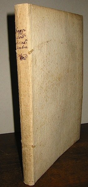 4to (cm. 25), 8 cc.nn, 128, VIII, XII pp. con due incisioni calcografiche al frontis. (raffiguranti il recto ed il verso di una medaglia con emblema della ‘Respublica Litteraria Umbrorum’), la seconda carta interamente incisa su rame (raffigurazione della Trinità) e il ritratto del dedicatario (Cardinale di York inciso da Giovanni Carlo Mallia. Numerosi capilettera e fregi n.t. Cartonato coevo con titolo ms. al ds. Ex Libris nobiliare. Eccellente esemplare in barbe. Edizione originale, assai raffinata e molto attraente per la qualità della stampa e delle incisioni. L’opera contiene gli Statuti della ‘Società letteraria’ fondata a Foligno e numerosi contributi (versi, orazioni, ecc.) dedicati a svariati argomenti da parte dei membri della medesima Società.