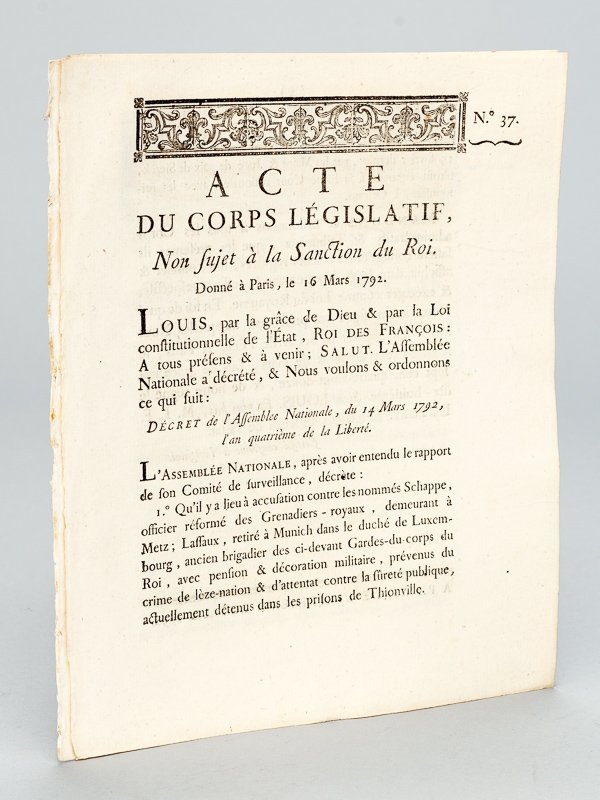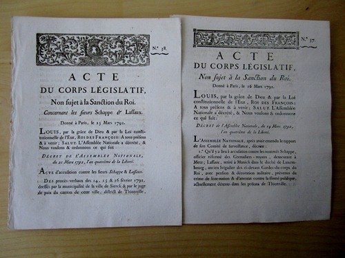 Acte du Corps législatif Non sujet à la Sanction du Roi. Donné à Paris le 16 mars 1792. Décret de l'Assemblée Nationale du 14 mars 1792 [ On joint : ] Acte du Corps législatif Non sujet à la Sanction du Roi. Donné à Paris le 25 Mars 1792. Décret de l'Assemblée Nationale du 21 mars 1792 [ Décret d'arrestation contre les Sieurs Schappe & Lassaux, de Metz et Munich en Luxembourg, détenus à Thionville et décret d'accusation contre les mêmes pour crimes de lèze-nation & d'attentat contre la sûreté publique ]