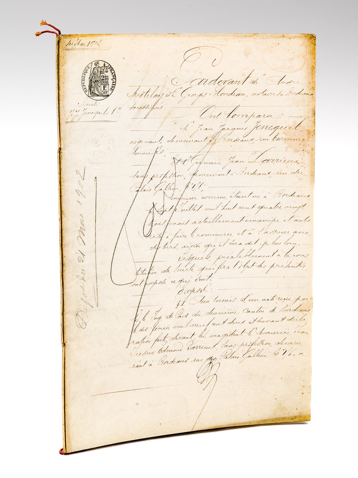 Acte authentique de 14 ff., daté et signé du 21 mai 1902 : Acte notarié (expédition) de dépôt des statuts de la Société J.J Jencquel & Cie, le 21 mai 1902. Société en nom collectif établie entre Jean Jacques Jencquel, négociant demeurant à Bordeaux, rue Turennes n°20 et Germain Jean Darrieux, mineur émancipé, sans profession, demeurant à Bordeaux, rue du Palais Gallien, n° 156. Germain Darrieux apporte la somme de 145.000 francs à la Société, dont 40.000 francs provenant d'un emprunt hypothécaire sur la "Villa Chopin" lui appartenant à Arcachon. Intéressant document. Très bon état.