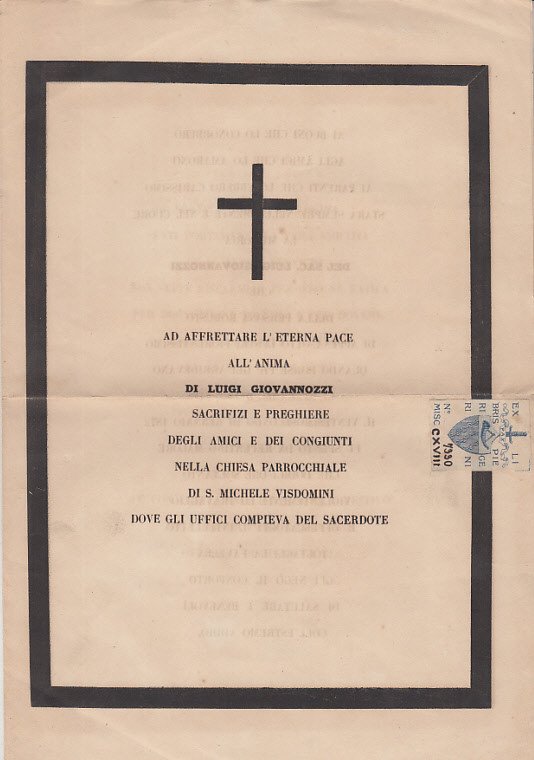 Ad Affrettare L'eterna Pace All'anima Di Luigi Giovannozzi Sacrifizi E Preghiere Degli Amici E Dei Congiunti Nella Chiesa Parrocchiale Di S. Michele Visdomini Dove Gli Uffici Compieva Del Sacerdote