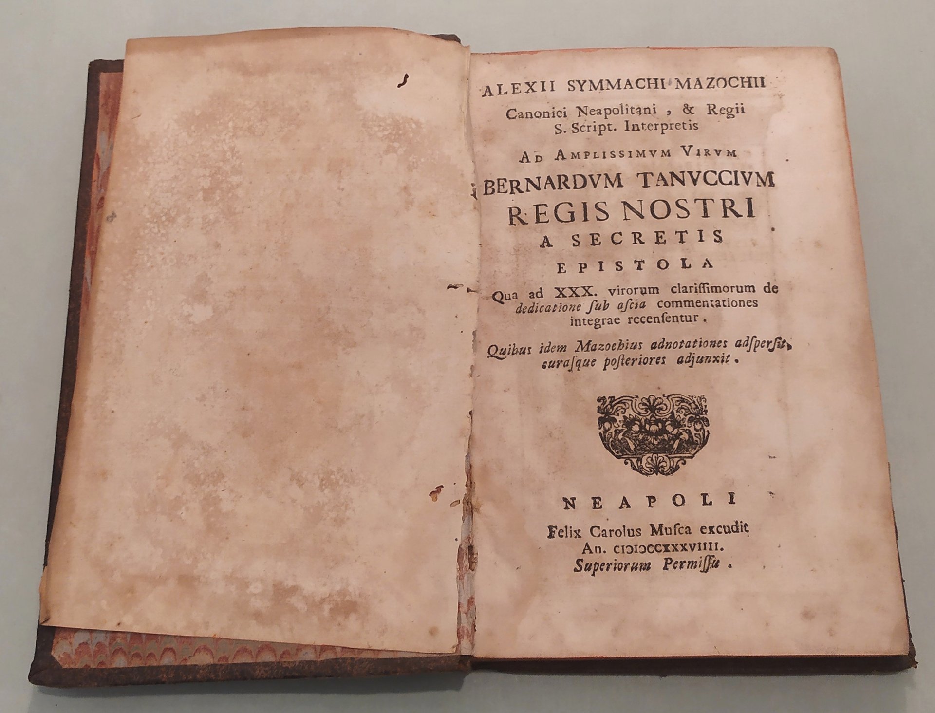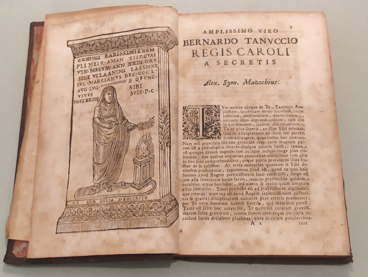 Ad amplissimum Virum Bernardum Tanuccium, Regis nostri a secretis epistola. Qua ad XXX virorum clarssimorum de dedicatione sub ascia commentationes integrae recensentur. Quibus idem Mazochius adnotationes adspersit curasque posteriores adjunxit.