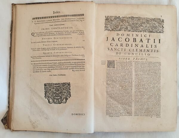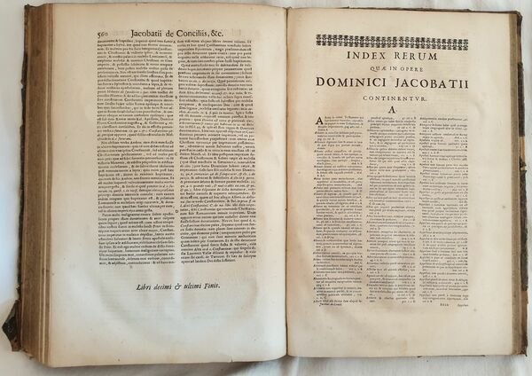 Bella edizione del 1672 di questa celebre opera di diritto canonico di Philippe Labbe (1607-1667) e Gabriel Cossart (1615-1674). L'opera era composta da 17 tomi, siamo purtroppo in possesso del 17° tomo. All'interno sono presenti opere del giuresconsulto canonista Domenico Jacobacci (1444-1527), del francescano bolognese Giovanni Antonio Delfini (1506-1561), il teologo veneziano Girolamo Donati (1456-1511), Marco Mantova Benavides (1489-1582), Paolo Fabulotti, Bartolome Carranza de Miranda (1503-1576), Pietro del Monte (ca 1400-1457). Antiche note manoscritte all'interno. Ex libris al contropiatto anteriore. In buone condizioni e completo. Copertina in mezza pergamena in mediocri condizioni generali con usure e parti mancanti ai margini e dorso. Legatura in buone condizioni. Pagine in buone condizioni con fioriture e bruniture. In folio. Dim. 38,5x27 cm. Pp. (10)+560+(20)+CLVIII. Beautiful edition of 1672 of this famous work of church right by Philippe Labbe (1607-1667) and Gabriel Cossart (1615-1674). The work was made up of 17 tomes, unfortunately wer only have the17° tome. Inside there are works by the church juresconsult Domenico Jacobacci (1444-1527), by juresconsult from Bologna Giovanni Antonio Delfini (1506-1561), theologian from Venice Girolamo Donati (1456-1511), Marco Mantova Benavides (1489-1582), Paolo Fabulotti, Bartolome Carranza de Miranda (1503-1576), Pietro del Monte (ca 1400-1457). Antrique handwritten notes inside. Ex libris in the internal counterplate. In good conditions and complete Half parchment coeval cover with wearings and losses in the edges and spine. Binding in good conditions. Pages in good conditions with foxings and yellowings. In folio. Dim. 38,5x27 cm. Pp. (10)+560+(20)+CLVIII.