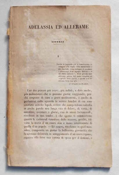 In 8° (cm. 22 x 13); pagg. (52); numerate da 557 a 608; brossura muta moderna; bruniture e qualche macchia. G. ** Stralcio prelevato materialmente dal primo volume della edizione originale di "Tradizioni italiane" la monumentale e rara opera diretta da Angelo Brofferio pubblicata in quattro volumi, ciascuno di quasi 1000 pagine, dal 1847 al 1850. Tradizione ligure. Alassio, Ferrania?