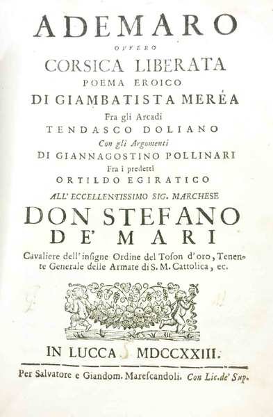 In-8 p. (mm. 218x155), p. pergamena coeva, tit. ms. al dorso, pp. (12),333,(3), vignetta xilografica al frontespizio. "Manca" l'antiporta.Dedica a Don Stefano de' Mari, Cavaliere dell'insigne Ordine del Toson d'oro, ecc., appartenente a una celebre famiglia genovese, di antichissima nobiltà, i cui membri avevano ricoperto varie volte la carica di Doge. Autore di questo poema celebrativo dei fasti della storia còrsa (Ademaro, togliendo a forza d'armi l'isola dalle mani de' Saraceni, ha dato alla Liguria un regno), composto da 14 canti in ottave, è Giambatista Merea, letterato arcade col nome di Tendasco Doliano. Rara "prima e unica edizione".Risguardo corto del marg. super. con parole mss. e cancellate; uniformi arross. interc. nel testo ma discreto esemplare.