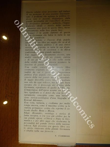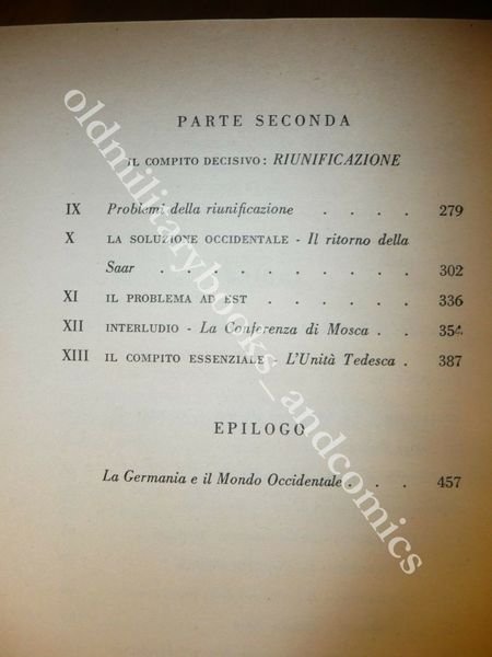 DESCRIZIONE: EDIZIONI POLITICA POPOLARE, NAPOLI 1959, br. ed. tel. con sovracc. a col. pp. 476 con 2 ill. in 8°. Questo libro rappresenta il primo tentativo, fino ad oggi, di un profilo sociobiografico del Cancelliere tedesco Konrad Adenauer. — Contemporaneamente, esso potrebbe servire da introduzione alla attuale situazione spirituale e politica della Germania — una situazione che è stata profondamente scossa dalle forze della rigenerazione liberate dopo la catastrofe del 1945. Senza dubbio, queste forze hanno la loro origine nella essenziale eredità culturale e spirituale della Germania, e sono state formate nella comunanza storica che lega la Germania, per la vita e per la morte, all'Europa e al mondo occidentale.Ne è venuto fuori un libro che si potrebbe definire a duplice livello: esso è composto di un piano storico-sociologico e di un piano sociobiografico. Sul primo di questi piani ho cercato di presentare le realizzazioni obiettive della Germania, sulla via della ricostruzione sociale e politica e della rigenerazione etico-politica. Sul secondo, invece, ho voluto tentare di raffigurare l'uomo sotto la cui guida politica la nuova Germania ha raggiunto la sua attuale posizione. La portata della personalità del Cancelliere Adenauer può essere valutata dalla tendenza, diffusissima in Germania e all'estero, d'identificare la Repubblica Federale con il nome e il prestigio personale del Cancelliere. L'unico significato che il comunissimo cliché della «Germania di Adenauer» può avere, è quello di sintetizzare il ruolo eminente avuto da Konrad Adenauer nella riabilitazione della nuova Germania e nel consolidamento della sua posizione internazionale. Ciò potrebbe già essere una ragione sufficiente per voler sapere qualcosa di più della sua capacità come statista e delle attuazioni da lui compiute, sia come espressione individuale, sia come fulcro sociologico delle forze spirituali e politiche, dalle quali dipende la rigenerazione della Germania. Data questa sua posizione «focale», la personalità del Cancelliere è adatta in maniera veramente eccezionale ad illuminare questo recentissimo capitolo della storia tedesca, le sue componenti non solo obiettive, ma anche personali. CONDIZIONI: Ottime/Perfette. Picola mancanza alla sovracc. sul retro. PESO / WEIGHT: 781 gr. without package