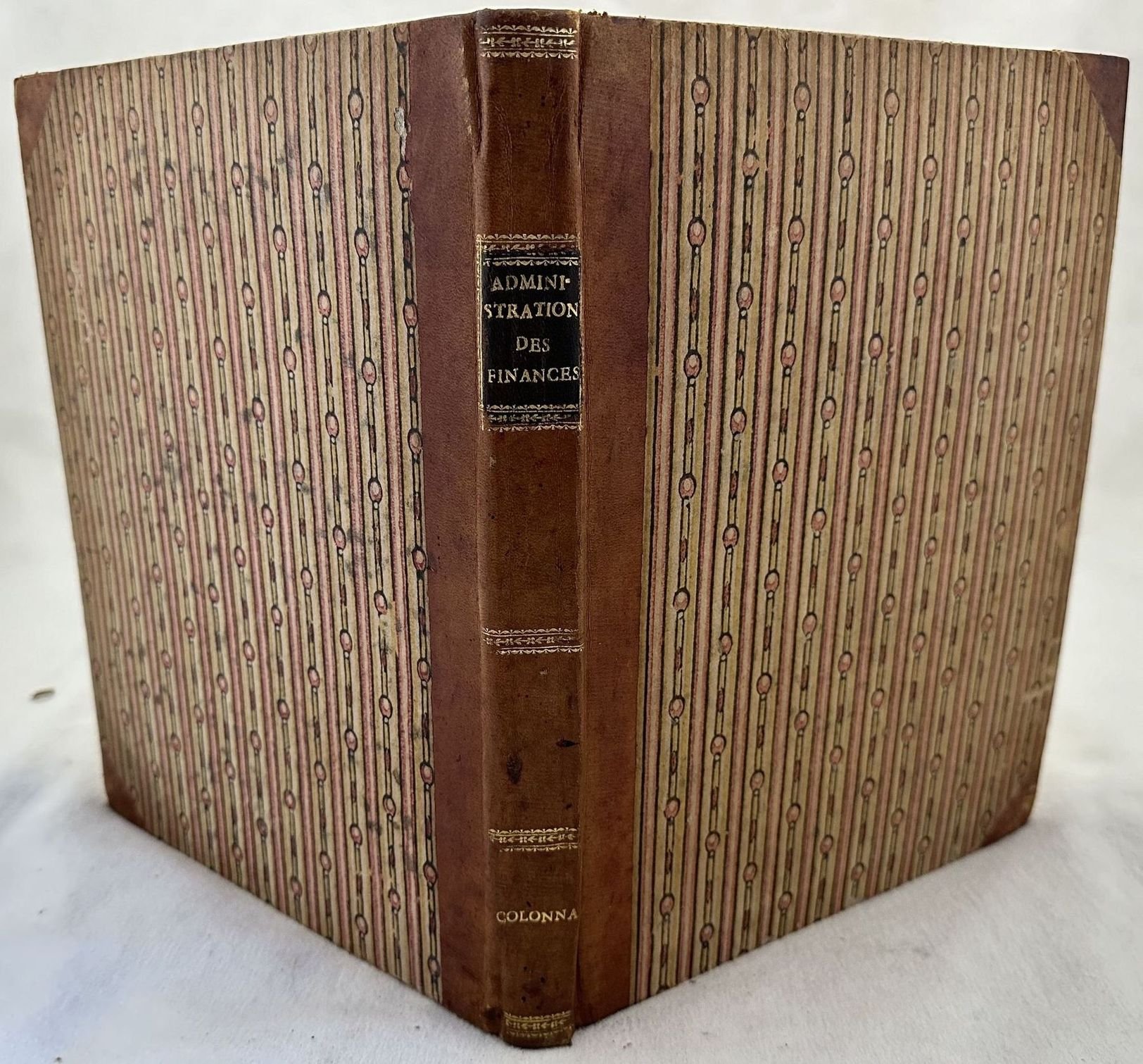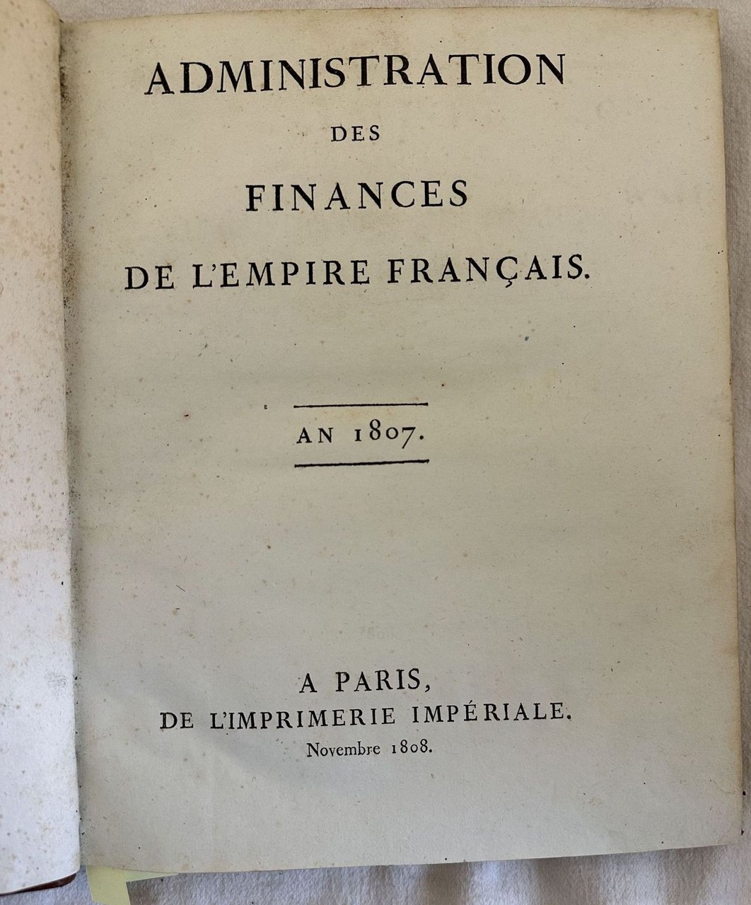 Interessante resoconto dell'anno 1807 dell'amministrazione finanziaria della Francia napoleonica. <BR><BR>All'interno numerose tabelle con indicazioni di spesa pubblica, pensioni, tesoro pubblico, guerra, Marina, Culti, polizia, Lotterie, Poste, Sale e tabacco, Monete, guerra.<BR><BR>Leggi e regolamenti.<BR><BR>In ottime condizioni e completo.<BR><BR>Copertina in mezza pelle coeva con titolo e decorazioni in oro al dorso in ottime condizioni generali con lievi usure ai margini e dorso. Legatura in buone condizioni. Pagine in buone condizioni con rare fioriture. In 4. cm 28,5x23. Pp. 201. Peso Kg. 0,870