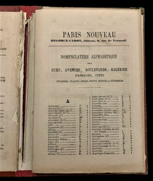 In folio grande; 30 pp. ed una grande tavola a colori più volte ripiegata con l'immagine di Parigi. Due piccoli strappetti senza perdita di carta in corrispondenza delle pieghe della tavola. Legatura editoriale rossa in mezza tela e con cartoncino rigido con titolo, autore ed editore impressi in oro al piatto anteriore. Rarissima edizione della famosa carta di Parigi e delle Banlieue del celeberrimo cartografo francese Alexandre Aimé Vuillemin, edita in occasione dell'Esposizione Universale di Parigi del 1878. Le 30 pagine contengono i nomi di tutte le strade, le avenues, boulevards, gallerie, passaggi, piazze, ponti, porte e poternes, poste, telegrafi, ambasciate, monumenti, fermate del Tramway (sia sud che nord), dei teatri e delle stazioni ferroviarie di Parigi. Alexandre Vuillemin (1812-1880) è stato uno dei più importante cartografi francesi del XIX° secolo. A fianco dell'attività di cartografo, portò avanti anche quella di editore. La sede della sua casa editrice si trovava a Parigi. Produttore di numerosi atlanti, le sue mappe sono note per l'uso frequente di ampie illustrazioni a margine della carta vera e propria. Vignette, personaggi famosi e vedute di città compaiono alternativamente nelle sue carte. Molto si sa della sua produzione cartografica ma assai poco della sua vita privata. E' risaputo che studiò sotto il cartografo francese Auguste Dufour (1798 1865). Le opere più importanti di Vuillemin sono, certamente, il suo Atlas Illustré de Géographie Commerciale et Industrielle dettagliato e altamente decorativo, nonché i suoi numerosi atlanti francesi anche se enorme successo e numerose ristampe ebbe la sua carta parigina. L'edizione qui presentata della carta di Parigi edita per l'Esposizione Univerale di Parigi del 1878 è una delle più rare da reperirsi ed ancor più rara da reperirsi completa della sua legatura originale e del libretto esplicativo. Esemplare in buone condizioni di conservazione.