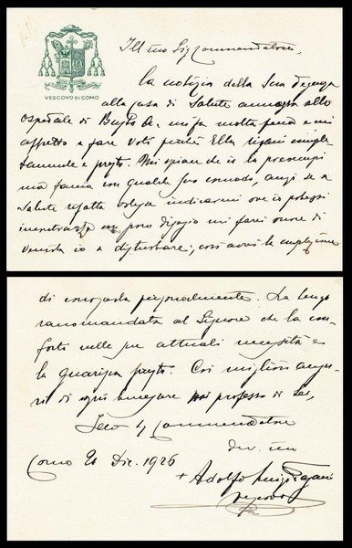 biglietto manoscritto e firmato del Vescovo Adolfo Luigi Pagani su carta intestata propria datato Como, 21 Dicembre 1926; ottimo es.