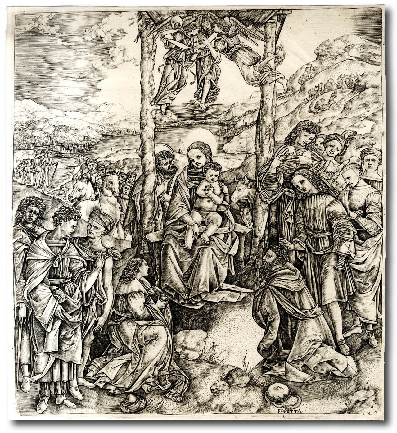 Cristofano Robetta (1462-1535) fu orafo e incisore fiorentino. Le sue incisioni trattano i soggetti più svariati, da quelli di carattere religioso fino alle allegorie dell'amore ed ai temi di natura erotica. Per questa composizione si ispirò all'opera omonima del 1496 del pittore Filippino Lippi, conservata agli Uffizi di Firenze, ma con alcune variazioni: la scena rappresentata appare speculare rispetto al dipinto e alcuni personaggi secondari, così come il paesaggio sullo sfondo, furono cambiati. "The introduction of three angels above is a new theme, suggested perhaps by Domenico Ghirlandaio's Adoration of the Magi of 1488 or, even more probably by Schongauer's nativity... Robetta's landscape shows details in the manner of Durer, but its general scheme may have been suggested by Perugino (e.g. in the Adoration of the Magi at Verona, Perugino, Klassiker der Kunst 1914, p. 219)". Esemplare nitidamente impresso su carta vergellata del XVIII secolo. La lastra originale fu venduta nel 1888 da Vallardi al British Museum.