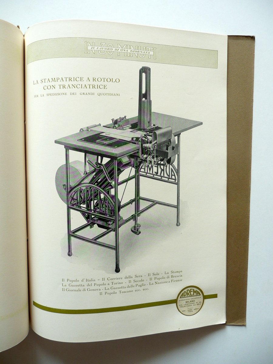 Catalogo industriale, Adrema" Macchine per indirizzi Milano, via Legnano 34 Officina d'Arte Grafica A. Lucini & C., Milano, s. d. (anni Venti del Novecento circa); cm 29,5x22,5, pp. non num. (pp. 58), con numerose belle ill. fotogr. in b/n nel t.; brossura ed. ill. a colori. Condizioni di conservazione Esemplare in buone condizioni con tracce d'uso, brossure con pochi minimi difetti e accenni di pieghette agli angoli e alle cuffie; margine inf. della brossura post. con un piccolo lieve alone. Interni buoni, complessivamente molto ben conservati; solamente una pagina con qualche piccola lieve abrasione da distacco all'illustrazione fotogr. e un minuscolo strappetto al margine est. (vedi foto). Ricco e bel catalogo industriale, corredato da numerose illustrazioni in bianco e nero di attrezzature d'ufficio e macchinari prodotti dall'azienda "Adrema" di Milano. SETT102.L9740 N "