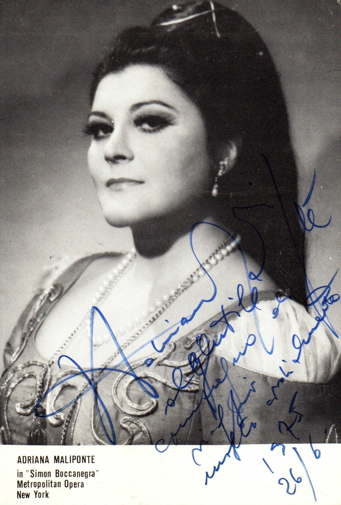 Dedica autografa del soprano su fotografia che la ritrae in occasione della messa in scena alla Metropolitan Opera di New York nel 1975. Ottimo stato.