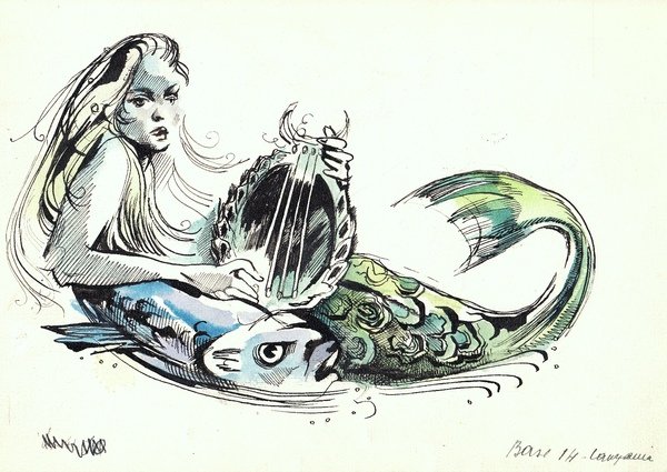 Adriano Cecchi. (Prato 1850 - 1936). Pittore e illustratore. Disegno originale a china ed acquarello della Musa Campania.