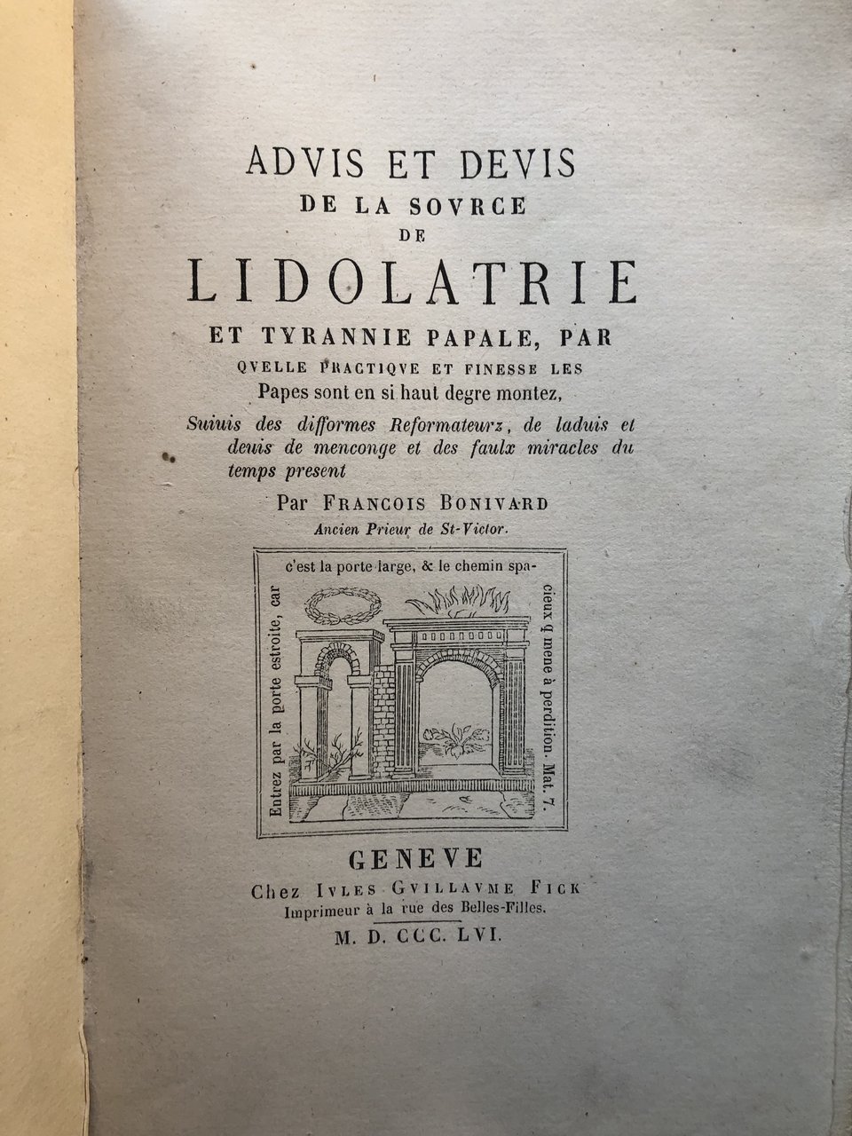Advis et Devis de la Source de Lidolatrie et Tyrannie Papale, par Quelle Practique et Finesse Les Papes sont en so haut degre montez, Suiuis des difformes Reformateurz, de laduis et deis e menconge et des faulz miralces du temps present.