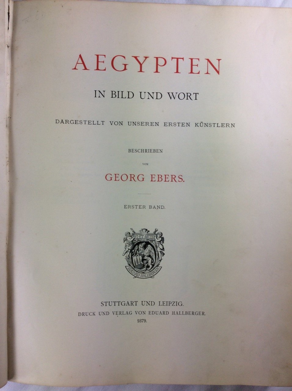 In-4 gr. (mm. 375x295), 2 volumi, legatura editoriale in mz. pelle, piatti telati (abrasioni) con pregevole ricca decorazione in oro e perline turchesi incastonate, dorso a cordoni (piccole manc.), fregi e titolo oro, pp. (8),VI,(2),387; XII,432; con 2 carte geografiche a colori f.t dell'Alto e Basso Egitto, molto ben illustrato nel testo da centinaia di xilografie, anche a piena pagina, che raffigurano vedute, costumi, personaggi, monumenti, etc. "Edizione originale". Georg Moritz Ebers (1837-1898), German Egypytologist and story writer. Ebers was a successful teacher; he visited Egypt many times and is remembered for his huge descriptive work on Egypt, "Aegypten in Wort und Bild", which enjoyed great popularity in its day and was translated into French and English; it contained many pictures of historical interest today.. (cfr. Who was who in Egyptology,p. 94). Fresco esemplare marginoso, ben conservato.