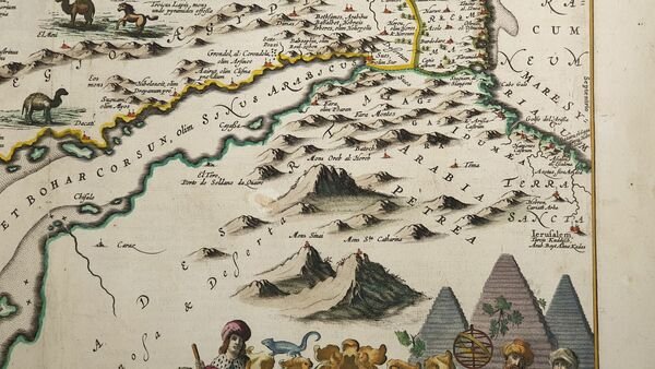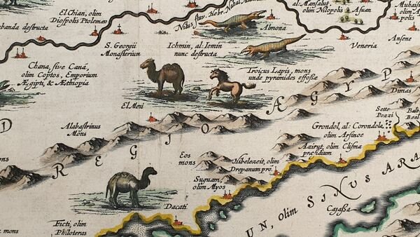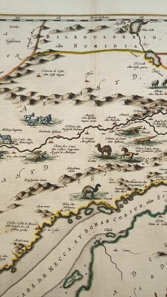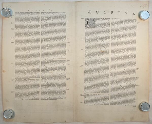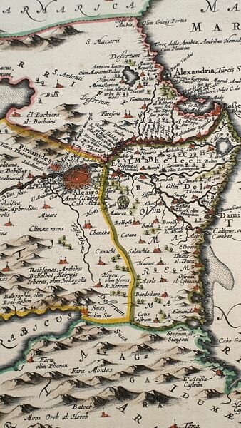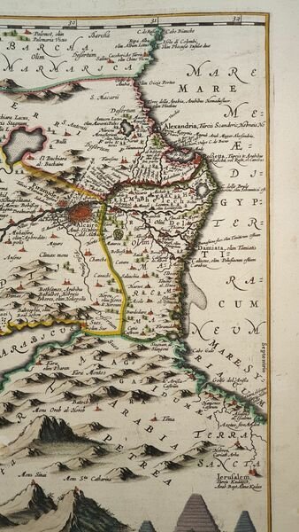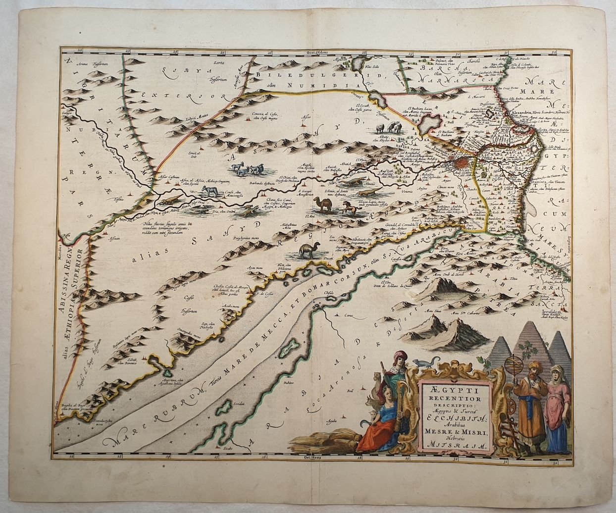 TiTOLO: “Aegypti recentior descriptio” tratto dal Nieuwen Atlas Amstelodami, Sumptibus Joannis Janssonii 1650 circa Dimensioni del foglio: 487 x 592 mm. Dimensioni dell'incisione: 452 x 506 mm. Tecnica: incisione su rame Condizioni generali: Eccellenti rare fioriture. Piccoli strappi marginali<BR><BR>Meravigliosa mappa dell'Egitto di grandi dimensioni acquarellata a mano tratta dall'Atlante "Nieuwen Atlas" [translation: The New Atlas], di Jan Jansson, pubblicata ad Amsterdam nel 1650 circa. La mappa mostra il Cairo e il fiume Nilo cosi come sfocia al Mar Mediterraneo. Orientata a 90 gradi a sinistra cosi che l'Egitto è in orizzontale. Bellissima raffigurazione delle Piramidi. Descrizione completa dell'Egitto in lingua latina al verso. Jan Jansson, celebre cartografo, appartenente ad una lunga stirpe di stampatori attivi a partire dal XVII secolo. Si stabilirono prima ad Arnhem poi ad Amsterdam. Furono stampatori di mappe, di libri e librai. Title: “Aegypti recentior descriptio” from Nieuwen Atlas Amstelodami, Sumptibus Joannis Janssonii 1650 circa Sheet size: 19.7 x 23.3 in; 487 x 592 mm. Plate area: 17.8 x 19.9 in; 452 x 506 mm. Overall condition: Excellent condition, with light foxing. Very little tears in the edges. A wonderful large scale hand-colored map of Egypt, from one of the great early 17th-century Atlas "Nieuwen Atlas" [translation: The New Atlas], by Jan Jansson, published in Amsterdam in 1650 circa. The map shows Cairo and the Nile River as it flows from the Mediterranean Sea. Oriented 90 degrees to the right so that the Nile is horizontal. Wonderful depiction of the Pyramids. Complete description of Egypt in latin language in the verso. Jan Jansson was part of an influential family of map publishers from the Netherland throughout the 17th century and beyond. They were based in Arnhem than in Amsterdam. They were printers, publishers and booksellers. Overall Condition: Excellent