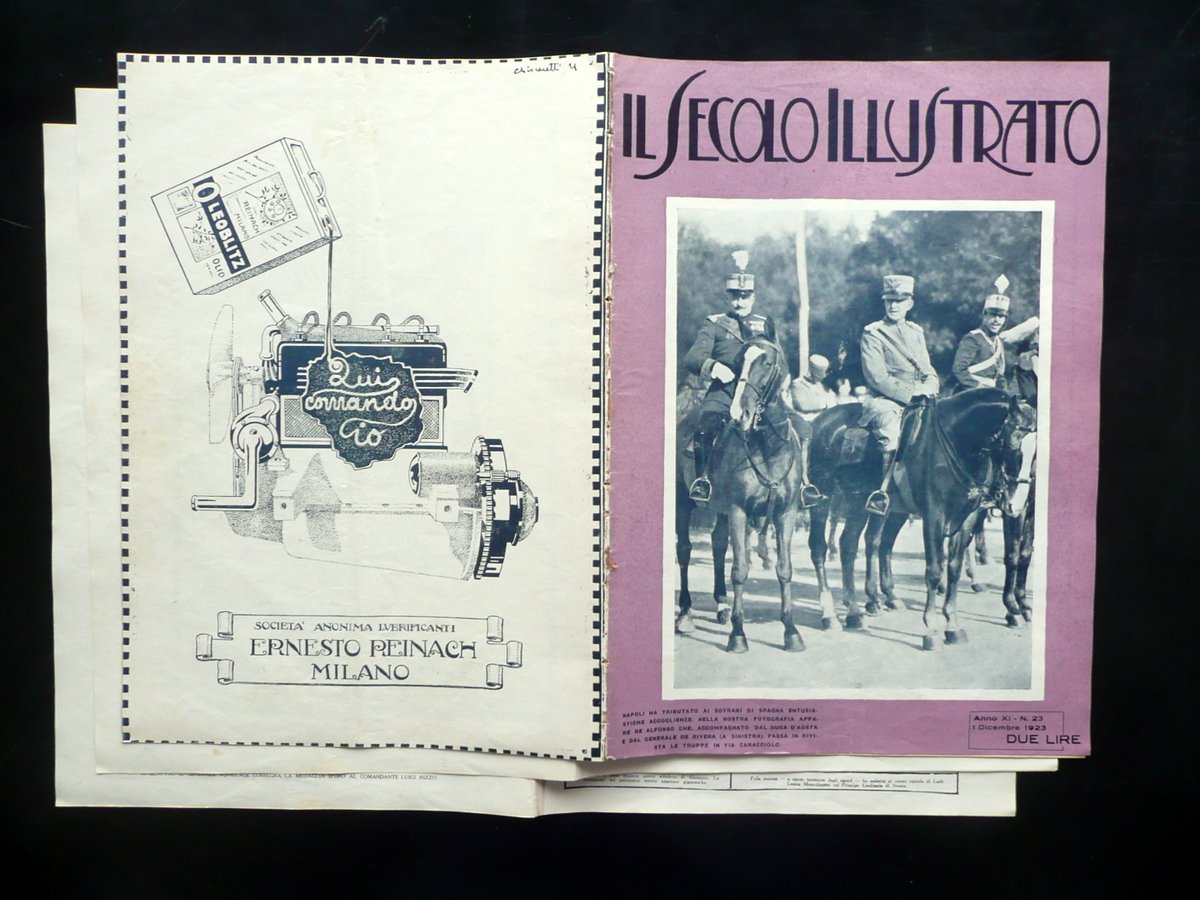 Rivista quindicinale, Il Secolo Illustrato" Rivista quindicinale della grande attualità Anno XI - Numero 23 1 Dicembre 1923 Anonima Editrice "Il Secolo", Milano 1923, cm 33,5x24; da pagina 709 a pagina 736 (esemplare autonomo con numerazione progressiva), con numerose ill. in maggioranza fot. sia in b/n che virate a vari col. n. t. e f. t., e con varie inserzioni pubblicitarie d'epoca fuori testo; brossura ed. ill. a colori. Numero completo. Condizioni di conservazione Esemplare in buone condizioni con tracce d'uso, margini lievemente rifilati, lieve traccia di piega longitudinale; dorso con alcune tracce di precedente inserimento dell'esemplare entro volume (vedi foto). Interni buoni; fogli sciolti per mancanza delle cuciture, ad eccezione di due applicati tra loro al margine int.; prime e ultime due pagine con normali lievi ingialliture del tempo. Pagina centrale dedicata a una "rivista" delle forze aeree italiane all'Aerodromo di Centocelle, alla quale assistì anche Re Alfonso di Spagna (vedi foto). Copertina dedicata alla visita del Re di Spagna in Italia: è qui ritratto insieme al Duca d'Aosta e al Generale de Rivera (vedi foto). Numero completo. SC03.D10669 N bis "