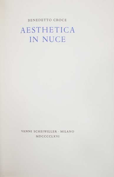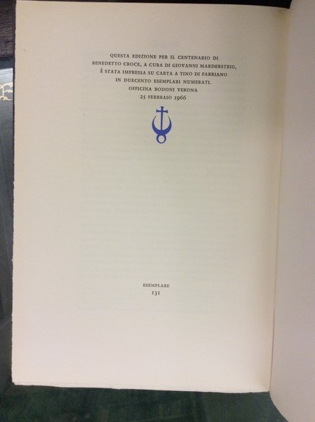 In-8 gr., legatura edit. in mz. pergam., tagli super. dorati, astuccio in cartoncino, pp. 52. Trattato filosofico scritto nel 1928, con una fotografia di Croce all'età di settantacinque anni (scattata da Herbert List nel 1949), riprodotta in calcografia; in fine una bibliografia dell'editore.Cfr. Cat. Mardersteig,143. Tiratura di 200 esemplare numerati, su carta a tino Fabriano, stampata per "Vanni Scheiwiller". Il ns., 131, è in perfetto stato.