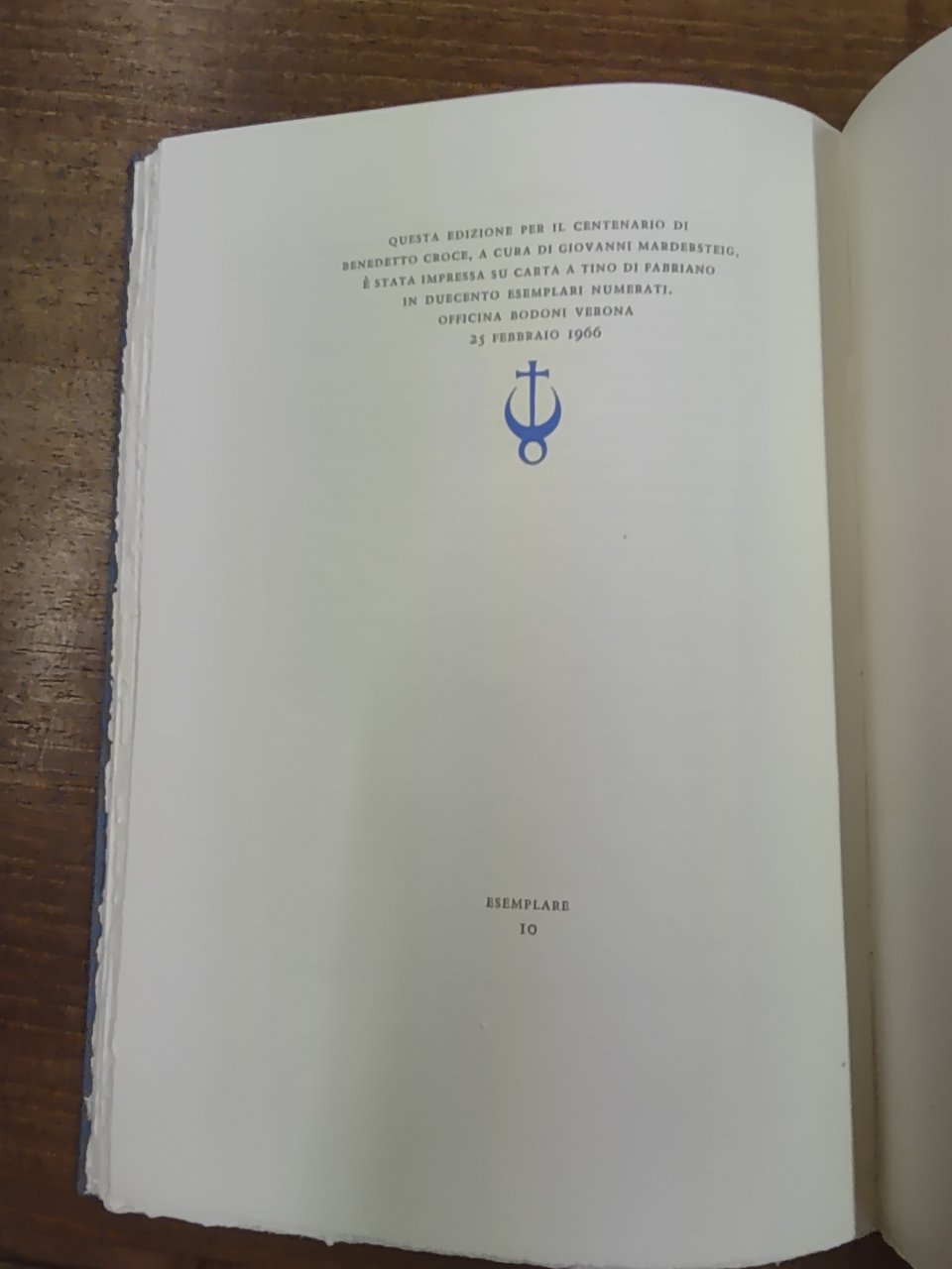 Edizione per il centenario di B.Croce, stampata a cura di G. Mardersteig, carta a tino Fabriano, 200 esemplari num. (num. 10). Perfetto con cofanetto