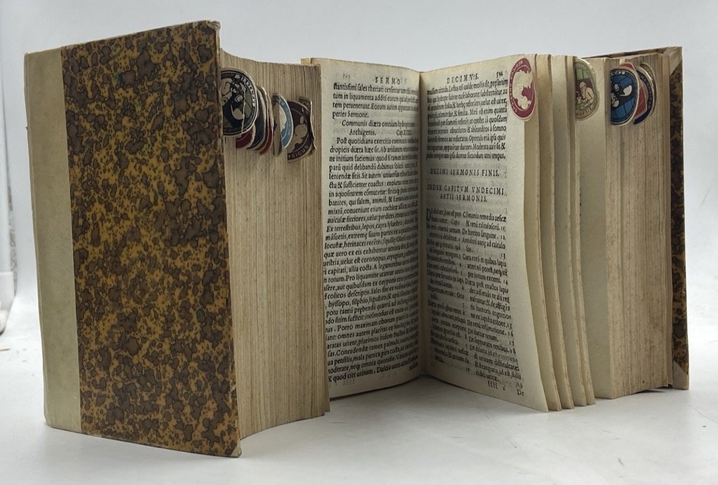- Antiche firme di proprietà sui frontespizi, su queste apposta una firma ex libris moderna timbrata (ripetuta sulle sguardie); solida legatura primo novecentesca, esemplare molto rifilato, con margini talvolta secanti i titoli correnti in testa, e con qualche alone e segno del tempo. Modesto esemplare ma ben completo delle marche e delle carte bianche, e del tutto fruibile. I sedici trattati sono curiosamente segnati da piccole etichette circolari applicate, sporgenti per metà, al margine della carta iniziale di ciascuna sezione; questi segnapagina risalgono presumibilmente agli anni ’30/’40 e portano illustrazioni di carattere medico con didascalia in latino o greco.