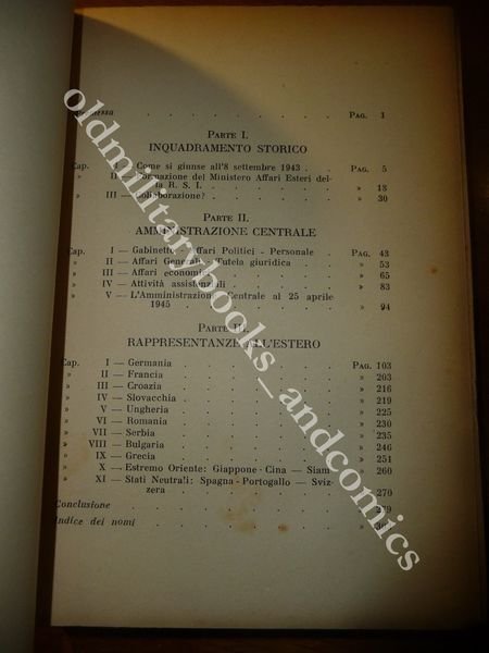 DESCRIZIONE: Magi Spinetti Editori Roma 1948 br. ed. pp. 307 in 8°. Molto RARO. Il volume esamina i rapporti esteri della RSI. E' diviso in: Inquadramento storico. Ministero degli Esteri della R.S.I. Collaborazionismo? Amministrazione Centrale. Affari politici, economici, generali. Personale. Attività assistenziale. Rappresentanze all'Estero. CONDIZIONI: Ottime, normali segni del tempo, tracce di fox. PESO / WEIGHT: 317 gr. without package