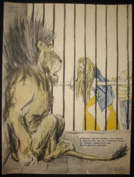 Leningrad, 1974. Affiche couleurs 1974 Leningrad, 1974. Affiche couleurs au format 56 * 42 cm et provenant de l'album "L'éducation" du groupe Fighting Pencil (Beovoy Karendash) de Leningrad. 2 déchirures en bord, sans manque. C'est au cours de Décembre 1939 ques des artistes de leningrad décident de créer le groupe Fighting pencil et produisent des affiches de propagande ou des affiches de caricature. Ses membres fondateurs étaient les artistes graphiques Ivan Astapov, Orest Vireysky, Valentin Kirdov, Vladimir Galba, Nikolai Muratov et Boris Semionov. La première affiche collective a été publié sur le sujet de la Guerre d' Hiver contre la Finlande," arbre de Noël." et entièrement peinte à la main. La première période de la "Bataille des Crayon" a pris fin avec la fin de la guerre avec la Finlande au printemps de 1940. En Octobre 1943, la première exposition du groupe Fighting Pencil s'ouvre à Moscou, à la Bibliothèque Lénine. Elle gagne l'attention du public, à la fois à Moscou et à Kouibychev ou l'exposition a été transporté. Après un arrêt de quelques années, le groupe reprend ses activités en 1956. Il produit à cette période, des affiches de satires sociales et politiques sur la vie interne en URSS et contre "l'impérialisme mondial", pour mener à bien la propagande politique visant à augmenter les taux de production et de la discipline du travail; à populariser le sport, l'hygiène et les règles de circulation; et la satire de la vie privée. L'association a continué à travailler jusqu'au début des années 1990, rejointe par des artistes tels que MS Belomlinsky, VA Galba, JV Efimovsky, VA Zavyalov, GV Kovenchuk, YP Lobachev et YV Trunev. D'autres affiches sont disponibles, envoi de photos sur demande.