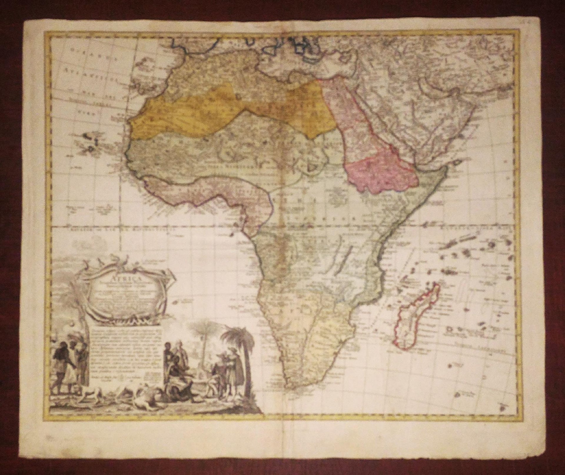 >Incisione in rame (cm 51.5x60) con colorazione di mano coeva. Bella e dettagliata carta complessiva dell'Africa, disegnata da Johann Matthias Hase e pubblicata nel "Atlantis Geographicus Maior" di Seutter, Matthaeus. Titolo entro cartouche decorata con figurine di pappagalli, e sotto al titolo descrizione di come la mappa è stata colorata a seconda delle diverse religioni; il tutto incorniciato da da uno scorcio di paesaggio marino sulla sfondo e, in primo piano, figurine di indigeni e mercanti europei con palme e animali decorativi, leoni e tigre. Magnifico e freschissimo esemplare.