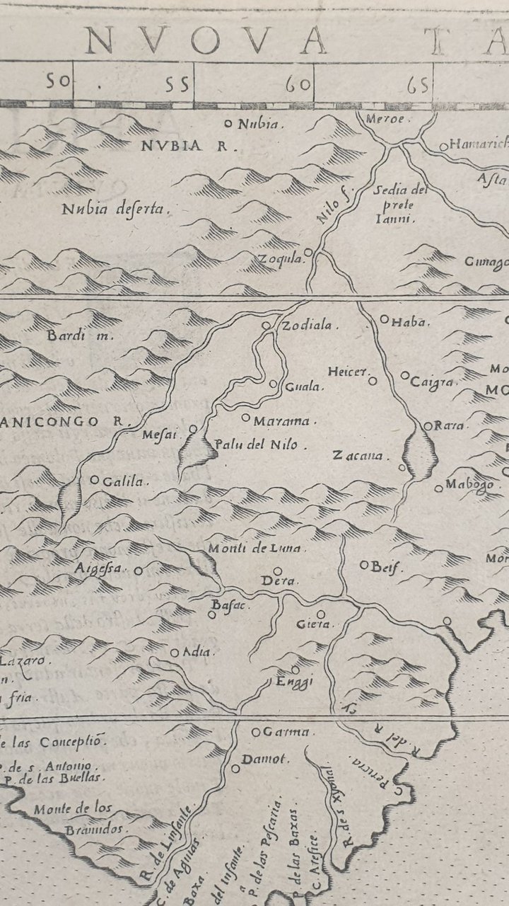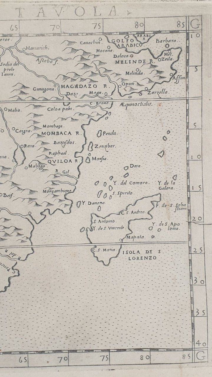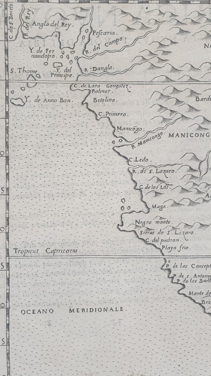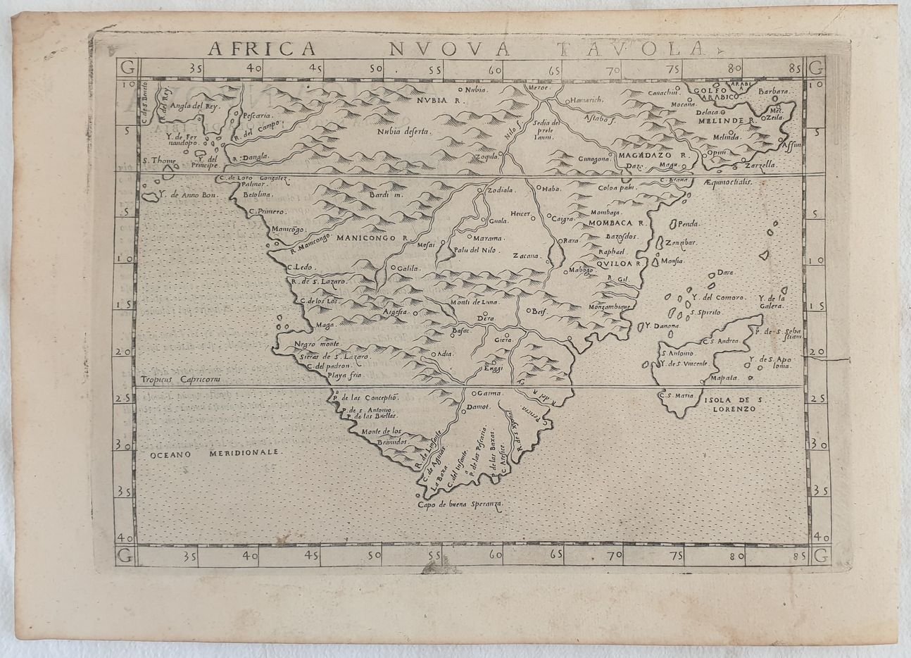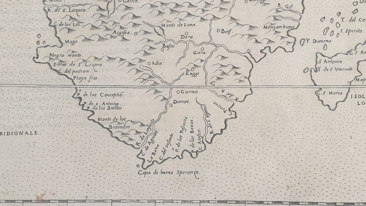 Mappa originale del Sud Africa 1574 di Girolamo Ruscelli che raffigura il Sud Africa con l'isola del Madagascar e Capo di Buona Speranza. Lingua italiana. AUTORE: Girolamo Ruscelli (1504 circa-1566) ATLANTE: La Geografia di Claudio Tolomeo alessandrino, già tradotta di greco in italiano da M. Giero. Ruscelli DATA: 1574 TECNICA: incisione su rame DIMENSIONI FOGLIO: 22x30,6 cm<BR>DIMENSIONI INCISIONE: 19x26,5 cm<BR>CONDIZIONI: Ottime condizioni. Due piccole macchie al margine inferiore. Map of South Africa of 1574 by Girolamo Ruscelli. In the map the Island of Madagascar and Cape of Good Hope. In the verso the description of South Africa in Italian language. Author: Girolamo Ruscelli (1504 circa-1566) Atlas: La Geografia di Claudio Tolomeo alessandrino, già tradotta di greco in italiano da M. Giero. Ruscelli Date: 1574 Technique: copper engraving Leaf Dimension: 22x30,6 cm (8.6x12 inches) Engraving Dimension: 19x26,5 cm (7.5x10.4 inches) Conditions: Very good conditions. Occasional foxing. Two little stain in the foot edge