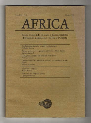In 8vo (cm 24x17) brossura editoriale pag. 316 con alcune illustrazioni. -- Indice: Confraternite islamiche somale e colonialismo (Federico Battera). Kenya: gestione di un progetto idrico tra i Meru Tigania (Margherita Lulli). Il Maghreb centrale agli inizi del XVI secolo (Federico Cresti). Ouidah (1861-71): missionari cattolici e «Brasiliani» a confronto (Rosario Giordano). Vedovato e l'Africa (Mario Pedini). Post-civil war Nigerian poetry (Oyeniyi Okunoye)