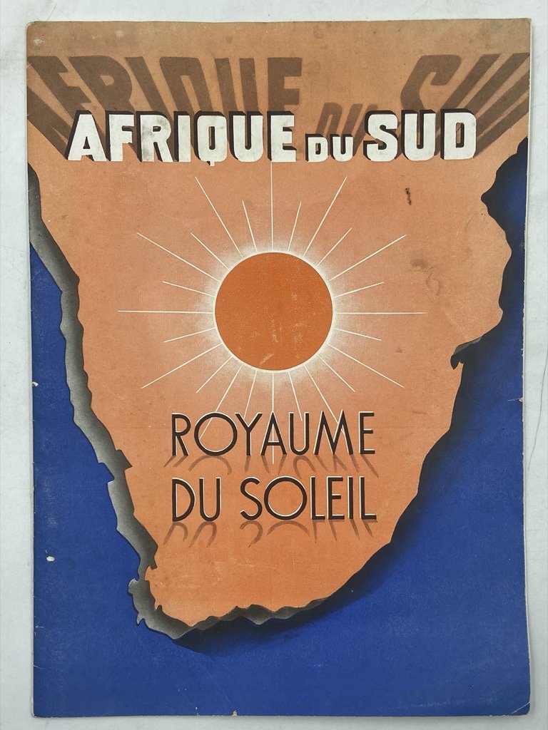 Spillato in brossura, cm 25x18, pp 24, 20 fotografie in nero, copertina a colori, testo in francese. Opuscolo di promozione turistica del Sud Africa, databile agli anni ’30 del Novecento, pubblicato in Francia. Il testo decanta la modernità del sistema di trasporti e le meraviglie naturali, e descrive Città e Penisola del Capo, Kimberley (cité des diamants), Johannesburg, Pretoria, le Cascate Victoria, le rovine Grand Zimbabwe, il Kruger National Park, Durban, lo Zululand, Pietermaritzburg, il parco naturale del Drakensberg, Bloemfontein. East London, Port-Elizabeth.