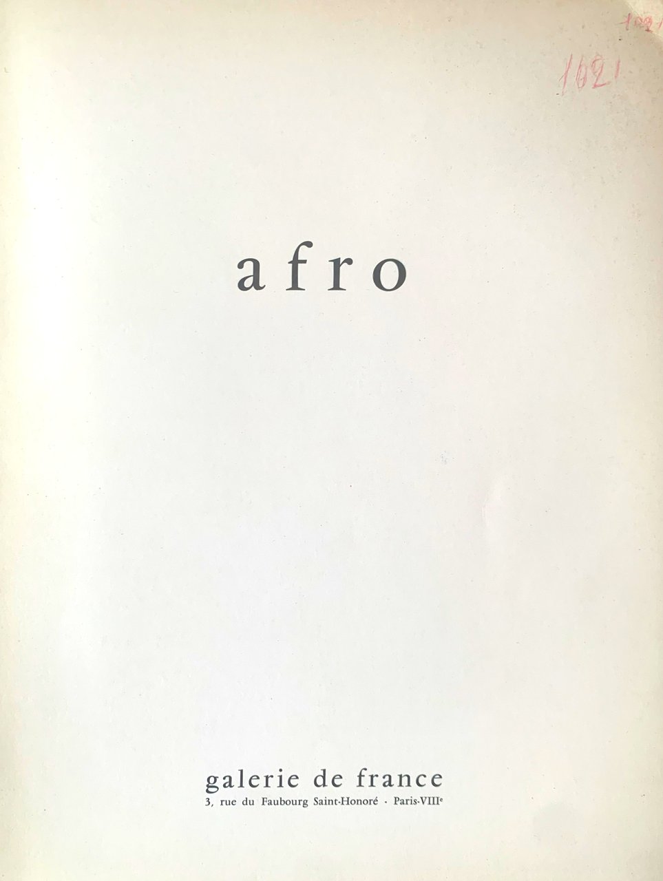 I ed. con tiratura limitata a 1500 copie del catalogo della mostra personale dedicata ad Afro Basaldella (Paris, galerie de france 10 aprile-10 maggio 1961): "Cette plaquette a été éditée à l'occasion de l'exposition des oeuvres récentes de Afro - 10 avril - 10 mai 1961 à la galerie de france. Elle à été tirée à 1.500 exemplaires sur les presses de l'imprimerie du compagnonnage. Reportage photographique, Sanford Hope, Rome" (Exemplaire numéro 1223). Testo in francese In-4, pp. 3, brossura illustrata al primo piatto con ritratto fotografico dell'Artista con ombrello a Roma ("tempo coperto", 1960, foto Sanford Hope, Roma). Il catalogo contiene 6 riproduzioni a colori delle opere di Afro Basaldella, 3 ritratti fotografici in b/n di Afro Basaldella, 7 riproduzioni in b/n delle opere di Afro Basaldella, una biografia, una bibliografia, un'indice delle illustrazioni. Stato buono (lieve usura della copertina ai margini - al primo piatto della copertina, in alto a sinistra numero di quattro cifre scritto a penna sottile coon inchiostro nero-grigio, poco visibile ma leggermente inciso - copertina e pagine leggermente ingiallite)