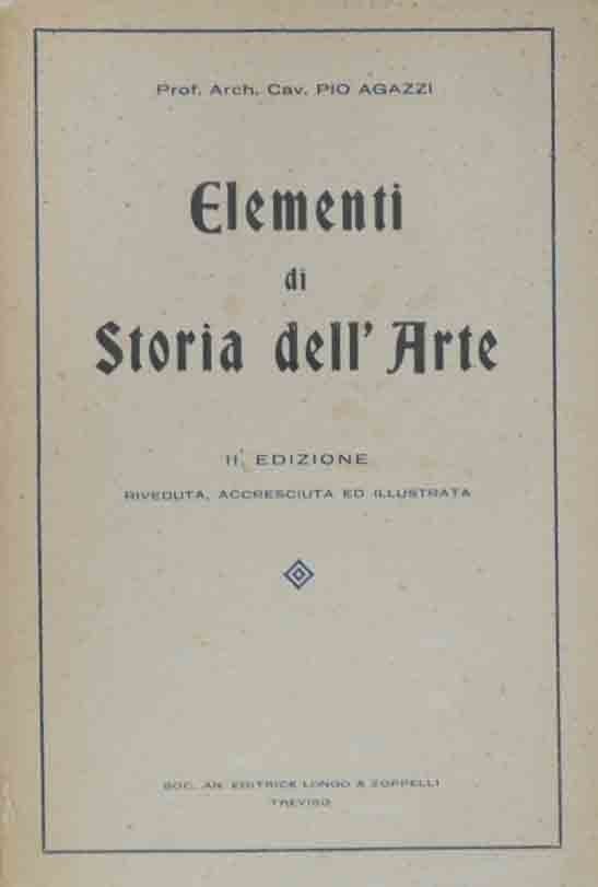 Pio Agazzi, Elementi di storia dell’arte. Con illustrazioni fuori testo ed intercalate, Soc. An. Editrice Longo e Zoppelli, Treviso 1932, seconda ed. riveduta, accresciuta ed illustrata, pp. 196, ill. b.n., cm 20, br. ed. Una piccola mancanza al dorso e due piccolissime mancanze alla copertina anteriore, leggere fioriture, per il resto ben conservato. Raro.