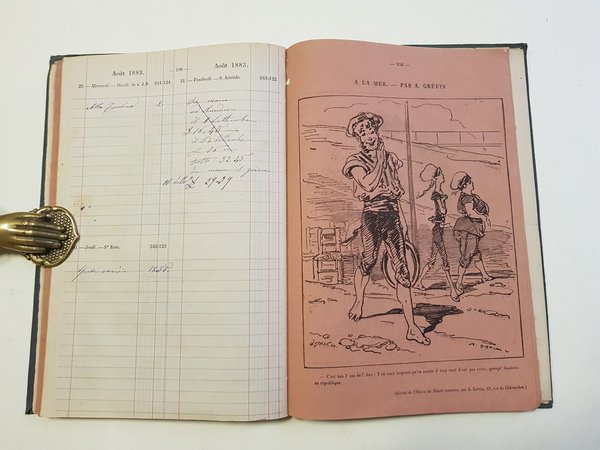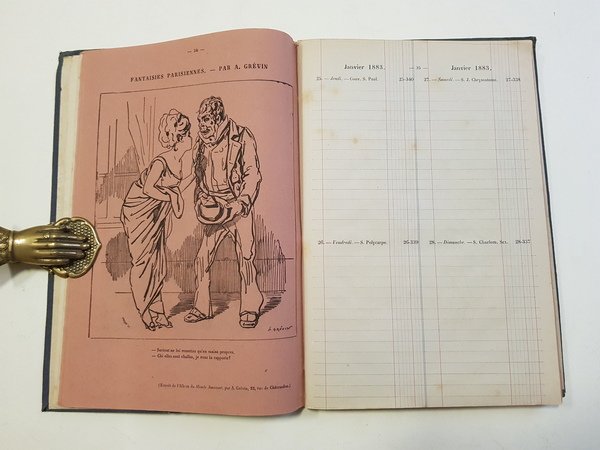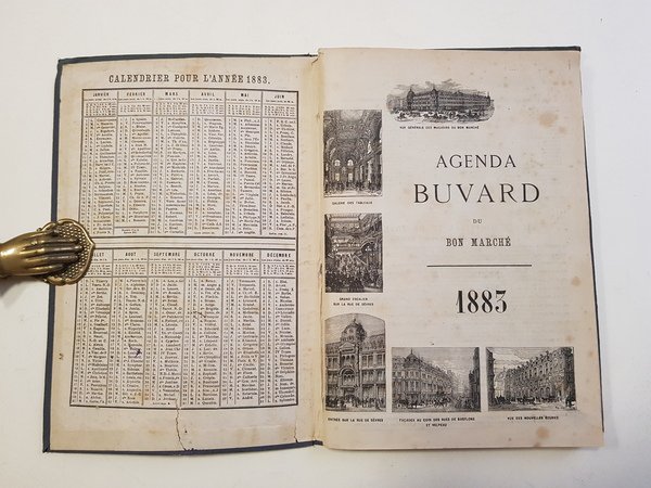 Cm. 28,5 x 19; pp. 252 con numerosissime illustrazioni nel testo ad opera di A. Grevin, L. Petit e altri e una grande pianta dei magazzini più volte ripiegata; legatura con copertina semirigida; cucito.<BR>Le prime 20 pagine contengono le piante dei teatri di Parigi; alle pagine dell'agenda si alternano pagine di vignette su carta colorata; le ultime pagine contengono informazioni utili (indirizzi, orari, ecc.).<BR>CONDIZIONI PIù CHE DISCRETE: scoloriture al dorso e ai margini della copertina; un paio di strappetti alle sguardie; alcune fioriture.<BR>Davvero graziosa, piena di sapore dell'epoca.