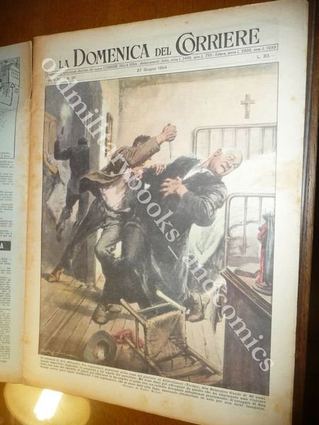 DESCRIZIONE: Domenica del Corriere, Milano, Anno 56 n. 26 (27 Giugno 1954). COPERTINA: "Prete di Allivellatori (Torino) sorprende dei ladri con cui ingaggia una lotta facendoli scappare." (dis. W. Molino) RETRO: "Inutile acrobazia. Gruppo di giocatori sorpreso in una villa, prova a scappare scavalcando il muro di cinta, ma ad attenderli c'erano gli agenti che li hanno portati in Questura." (dis. W. Molino) La Domenica del Corriere è stato un popolare settimanale italiano fondato a Milano nel 1899 e chiuso nel 1989. Apparve per la prima volta nelle edicole l'8 gennaio 1899 come supplemento illustrato del Corriere della Sera. Stampata in grande formato (sul modello del domenicale La Tribuna illustrata), aveva 12 pagine e veniva distribuita gratis agli abbonati del Corriere, oppure si poteva acquistare in edicola per 10 centesimi. La prima e ultima di copertina erano sempre disegnate. Il Corriere si avvaleva di un giovane disegnatore, Achille Beltrame, allora sconosciuto, a cui veniva affidato in ogni numero il compito di rendere con la sua tavola il fatto più interessante della settimana. Dopo la sua morte nel 1945, fu sostituito da Walter Molino che, come il suo predecessore, firmò memorabili copertine. A differenza dei settimanali dell'epoca, la Domenica del Corriere diede ampio spazio alle fotografie e ai disegni, e questo fu uno dei motivi del suo successo. CONDIZIONI: Buone con sovracc. azzurrina presenti pieghette. PESO / WEIGHT: 100 gr. without package
