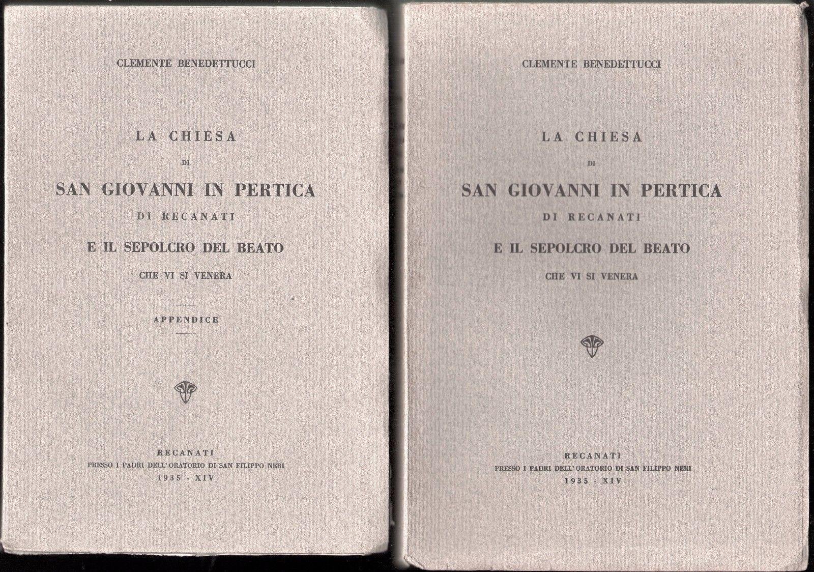 LA CHIESA DI SAN GIOVANNI IN PERTICA DI RECANATI E IL SEPOLCRO DEL BEATO CHE VI SI VENERA. RECANATI PRESSO PADRI DELL'ORATORIO DI SAN FILIPPO NERI L 5630 CLEMENTE BENEDETTUCCI RECANATI 1935. VOLUME 1 PP. 389 VOLUME 2 (APPENDICE, PARTE SECONDA) PP. 99 + (PARTE TERZA) PP. 49 + 25 TAVOLE CM. 24 X 16 IL FOGLIO. (PARTE QUARTA) PP.64 + UNA PAGINA DELLE AVVERTENZE CHE SPIEGA CHE IN QUESTO PUNTO L'OPERA » RIMASTA INTERROTTA. CM. 26,5 X 18. SPLENDIDA E NON COMUNE OPERA CHE TRATTA DALLE ORIGINI DEI BENEDETTINI E DEGLI APOSTOLINI E DELLA STORIA NON SOLO DELLA CHIESA CITATA MA ANCHE UNA BREVE STORIA DI RECANATI.