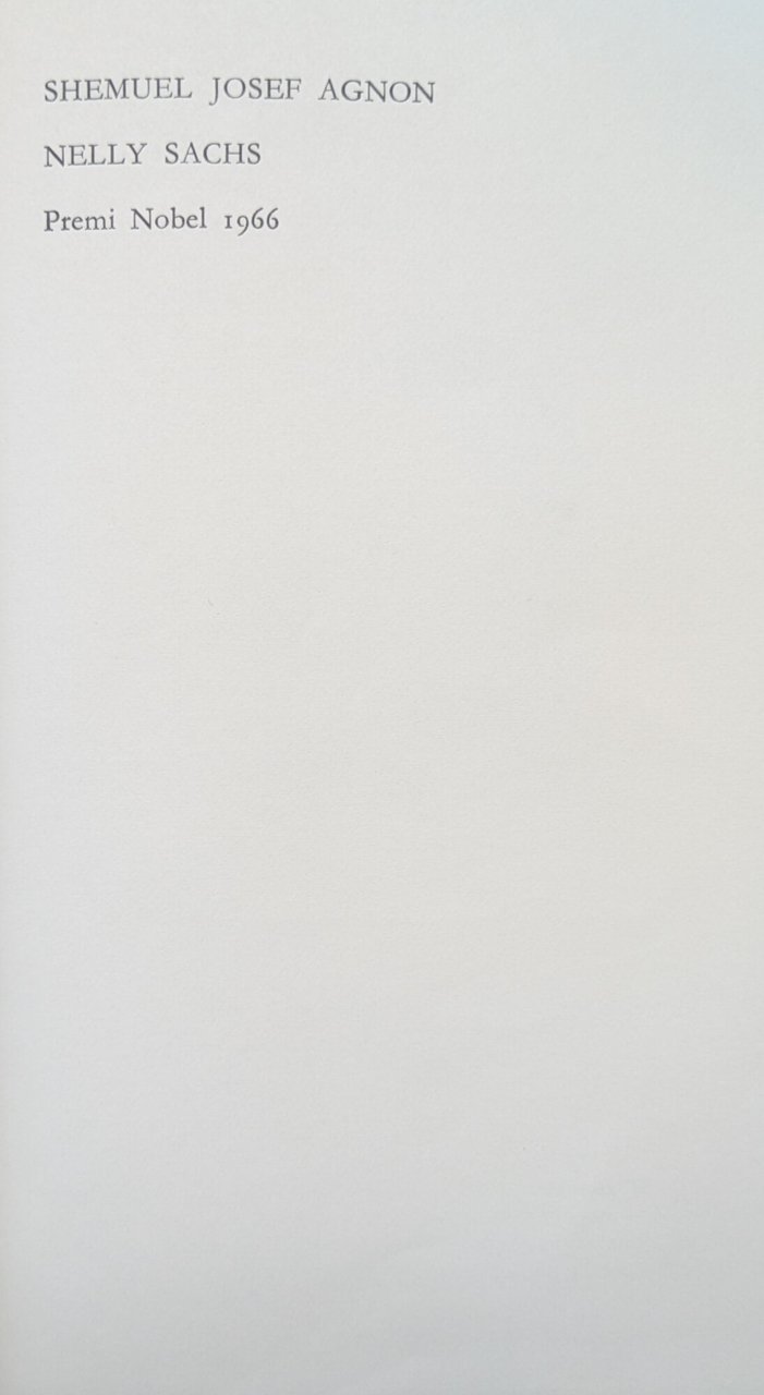 Contiene: Racconti di Gerusalemme / Shemuel Josef Agnon . Poesia / Nelly Sachs. Trad. di Elena Monselise Ottolenghi, Ida Porena, Roberto Fertonani. Premio Nobel 1966. in ottavo leg. cart. pp. 802 Buono (Good) Buon es..