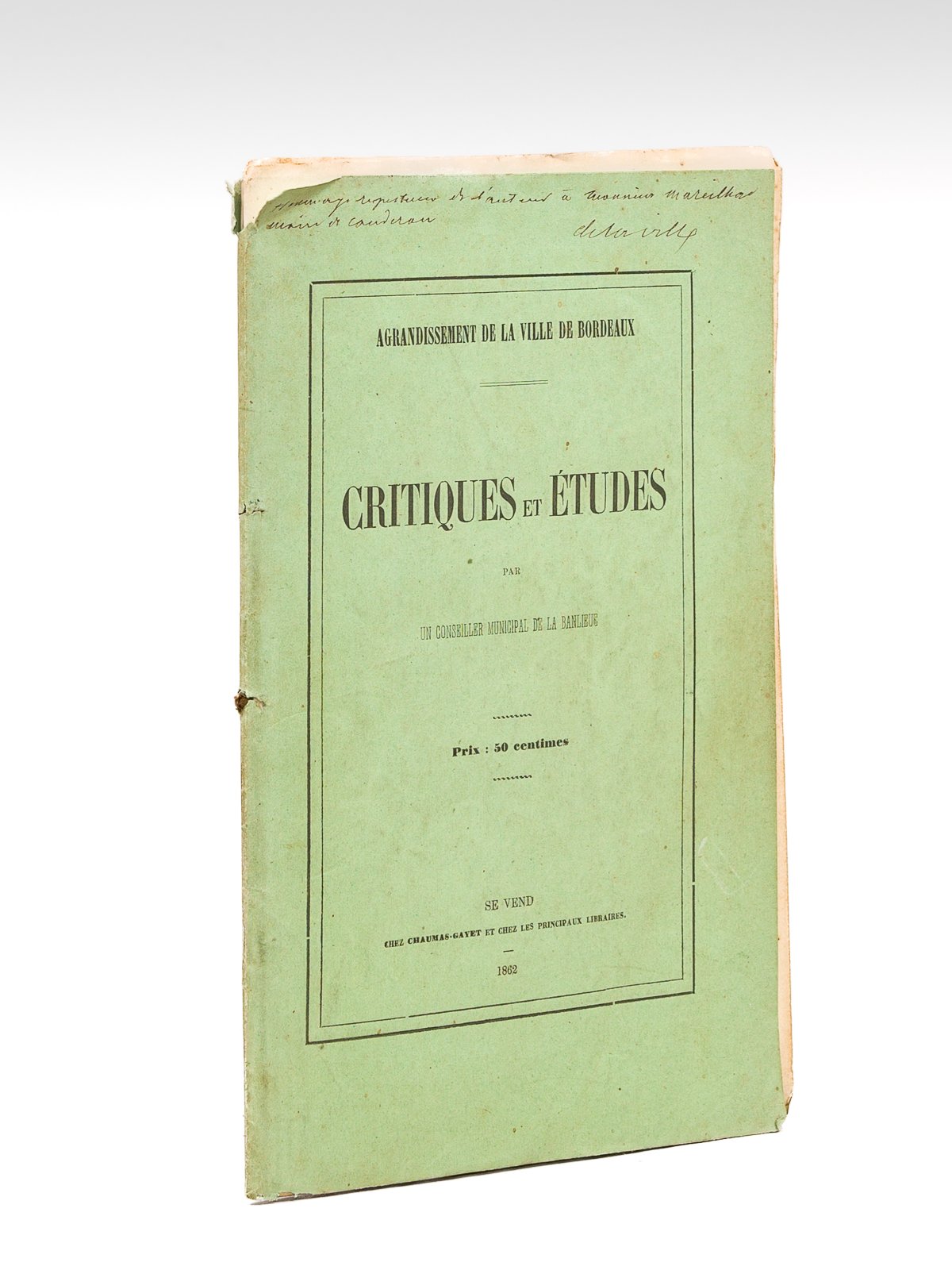 1 vol. in-8 br., Chez Chaumas-Gayet et chez les Principaux Libraires, [ Bordeaux ], 1862, 63 pp. Bel envoi signé "de La Ville" : "Hommage respectueux et d'auteur à Monsieur Mareilhac, maire de Caudéran". Très intéressant exemplaire, dont la dédicace permet de lever l'anonymat qui pesait encore sur l'auteur de ce travail lors de son évocation par Louis Desgraves et Georges Dupeux (in "Bordeaux au XIXe siècle", 225): "Partisan de l'extension de la cité, il entendait lui donner des limites raisonnables et ne pas étendre démesurément la superficie de l'agglomération. Il proposait de limiter l'annexion sur la rive gauche au boulevard projeté, et, sur la rive droite, à la partie bâtie de La Bastide et à la rive du fleuve".Etat très satisfaisant (petit accroc en coiffe sup., couv. faible, bon état par ailleurs)