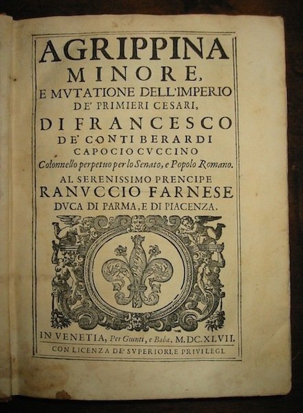 4to (cm. 21,8), 8 cc.nn. (compresa bella antiporta fig. a piena pagina e frontis.), 419(1) pp., 24 cc.nn. (Indice). Legatura posteriore in cartonato policromo. Ottimi interni. Edizione originale di questa storia dell’Impero romano da Claudio a Vespasiano. Vinciana, 469.