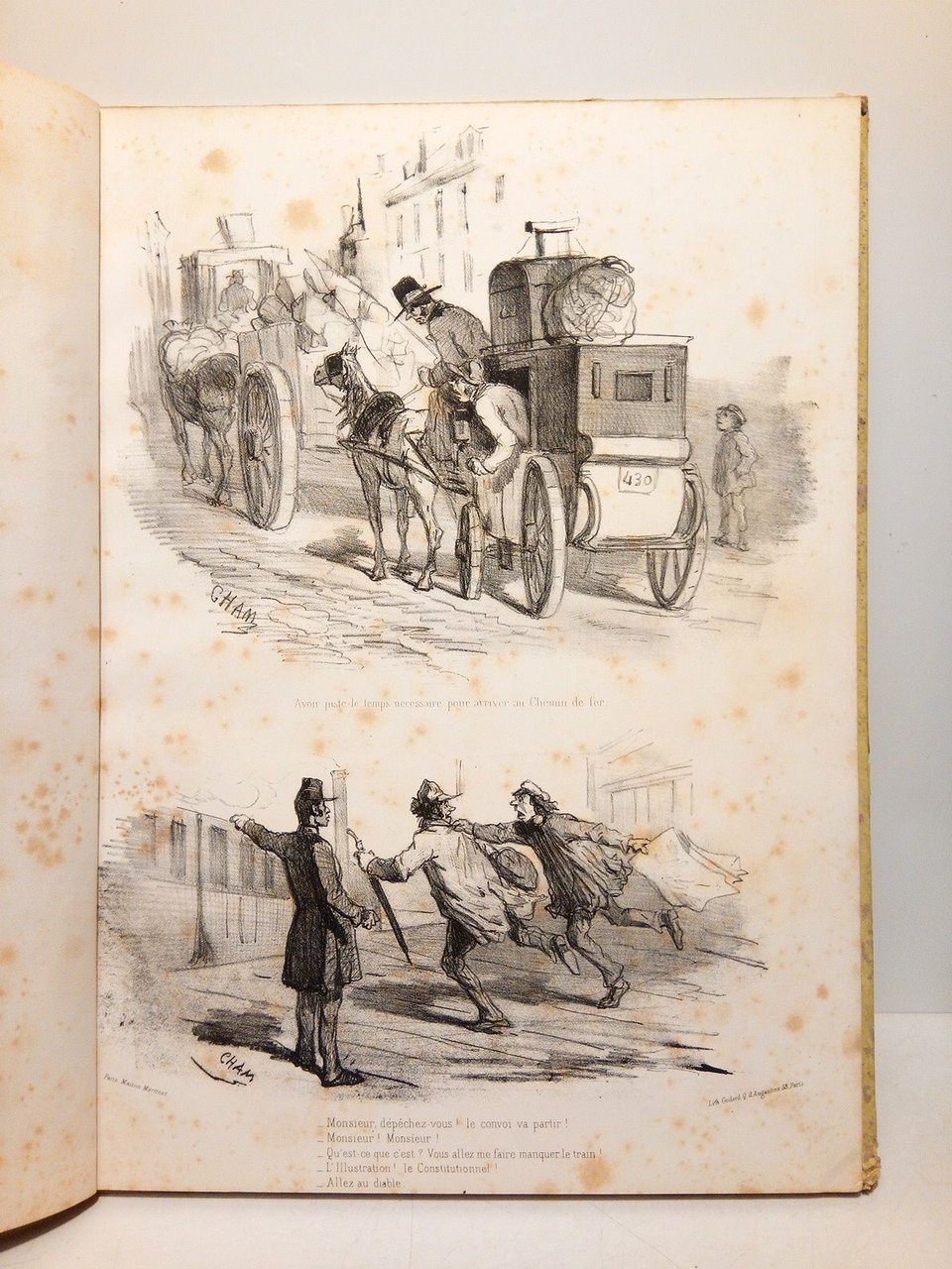 [PRIMERA EDICION ?].- Paris: Maison Martinet, Hautecoeur frères, [ca. 1858].- [1 h.], 20 folios de láminas litográficas en negro + la portada, con 2 figuras en cada lámina y leyendas al pie de cada dibujo, grabadas solamente en la cara anterior; Folio mayor (34,5 x 26 cm); Texto en francés; Cartoné Ed.- La obra constituye una graciosa visión satírica y crítica de los viajes en diligencia y ferrocarril en aquella época. MUY RARO.* Encuadernación original ligeramente fatigada, con roces en las esquinas y pequeños desperfectos en la cabeza y pie de la lomera. El interior en muy buen estado salvo algunas motas de óxido. CUENTOS, AVENTURAS, LEYENDAS, LITERATURA INFANTIL, CÓMICS, HUMORISMO.