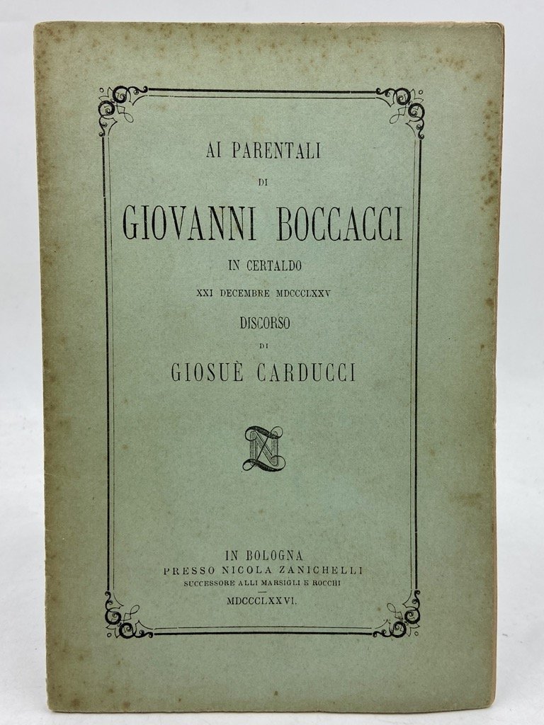 AI PARENTALI DI GIOVANNI BOCCACCI IN CERTALDO XXI DECEMBRE MDCCCLXXV. Discorso di Giosuè Carducci. In Bologna presso Nicola Zanichelli successore alli Marsigli e Rocchi MDCCCLXXVI.