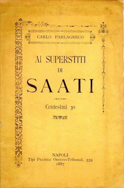 Ai superstiti di Saati, edizioni 1887, pp. 7, formato 15 x 23. <BR>Copertina di colore ocra con titoli in nero al piatto anteriore. <BR>Leggeri segni del tempo ai piatti. Nel complesso buone condizioni.
