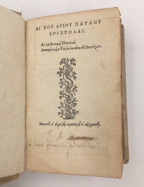 This is the second and last volume of the New Testament. In-16° antico (cm. 12x7,6), pp. 361, (3). Fini e insolite testatine (e capilettera) di sinuose intricate volute al tratto. Solida piena perg. rigida antica, con tit. aggiunto poi a penna al ds. Ben risarcita e integrata con perg. antica una piccola mancanza al bordo inferiore del piatto ant. e alla cuffia inf. Perfetto nelle sue barbe l'interno, in cui ogni pagina è stata inquadrata originalmente da fini precisi filetti rossi tracciati a cura dell'editore. Antico ex libris (parrebbe coevo) a penna "Francisci Boutillier". Si tratta del 2° vol. del "Novum Testamentum", contenente il TESTO GRECO delle Epistole di Paolo, delle Epistole "cattoliche", e dell'Apocalisse, una delle più belle edizioni di Roberto STEFANO (Parigi 1499-Ginevra 1559), il "Manuzio francese", prestigioso figlio d'arte, umanista, uno dei primi a stampare in eleganti caratteri greci; "per aver pubblicato una Bibbia con la versione di Leone Giudeo e con note alterate da Calvino, fu poi costretto a fuggire da Parigi, riparò a Ginevra e passò al Protestantesimo" (Diz. Eccl., 3, p. 976). In questa ed. e in quelle del 1549 e 1550 introdusse nel testo erasmiano correzioni dalla vers. Poliglotta Complutense; solo più tardi, nel 1551, vi abbinò il testo latino e divise il testo greco per la prima volta in versetti (Cath. Encycl.). Al front., bella FIGURA xilogr. (stupendo serpente attorcigliato a una fronzuta lancia, sopra dedica in greco. All'ultima facciata, grande MARCA editoriale con saggio indicante un albero con fronde e frutti, da cui cadono alc. rami (motto su cartiglio "Altum sapere"). RARISSIMO E IMPORTANTE, censito da ICCU solo alla Casanatense e alla Naz. di TO, che posseggono anche il vol. precedente.