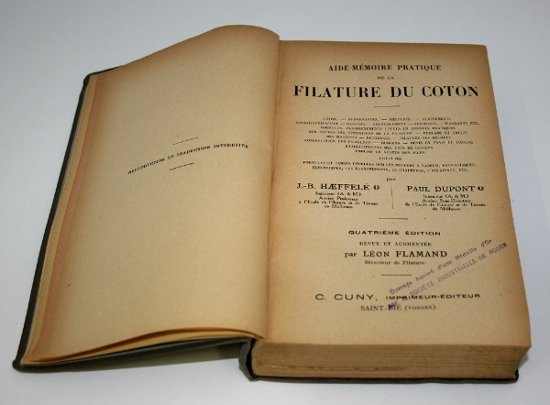 Legatura in tela (cm 18,5x12) pag 642 con 181 disegni e foto e 67 pag. di pubblicità illustrata attinente. Buono stato. -- Tutte le operazioni di filatura del cotone, uso di macchine con motori a vapore, idraulici, elettrici, classificazioni del cotone, mercati, speculazione, condizioni di acquisto, spedizioni, ecc.