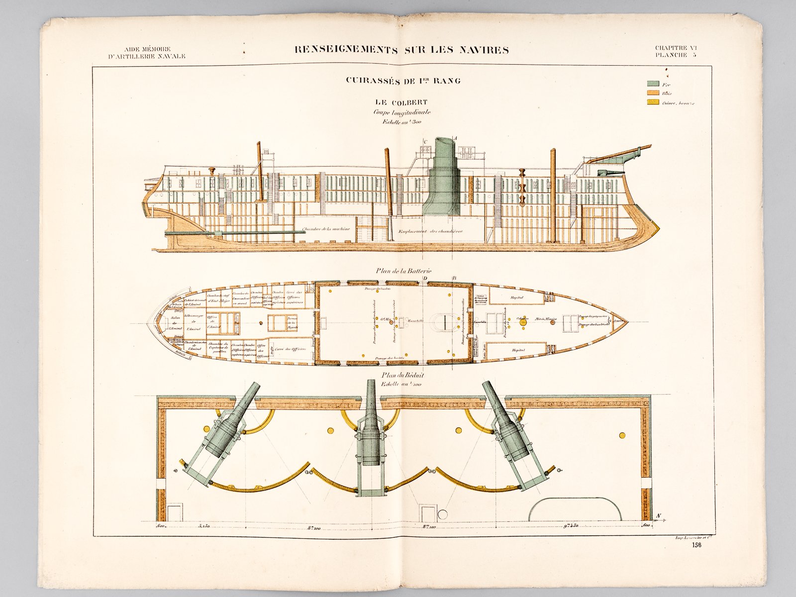 Aide-Mémoire d'Artillerie Navale. Planches. 3e Livraison 1878 (Chapitre VI : Renseignements sur les navires) : Planche 5 : Cuirassés de 1er Rang. Le Colbert. Coupe longitudinale. Plan de la Batterie. Plan du Réduit [ On joint : ] Planche 6 : Cuirassés de 1er Rang. Le Colbert. Demi-Tourelle pour canon de 27 c/m ; Coupe de la batterie suivant l'axe d'un sabord ; Plan d'une Demi-Tourelle ; Plan de l'affût installé au sabord