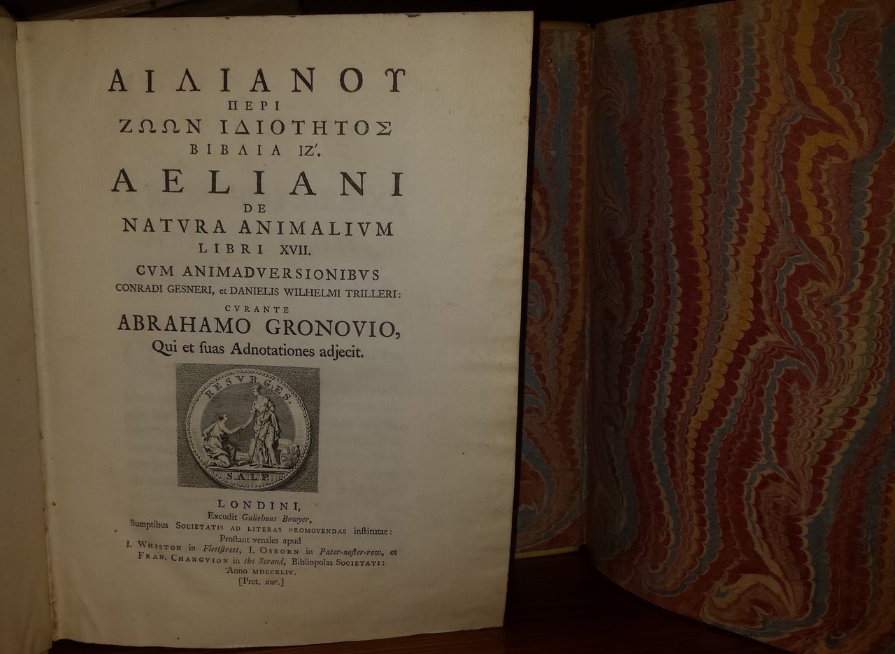 Ailianou Peri zoon idiotetos biblia 17. Aeliani De natura animalium libri XVII. Cum animadversionibus Conradi Gesneri, et Danielis Wilhelmi Trilleri: curante Abrahamo Gronovio, qui et suas adnotationes adjecit.