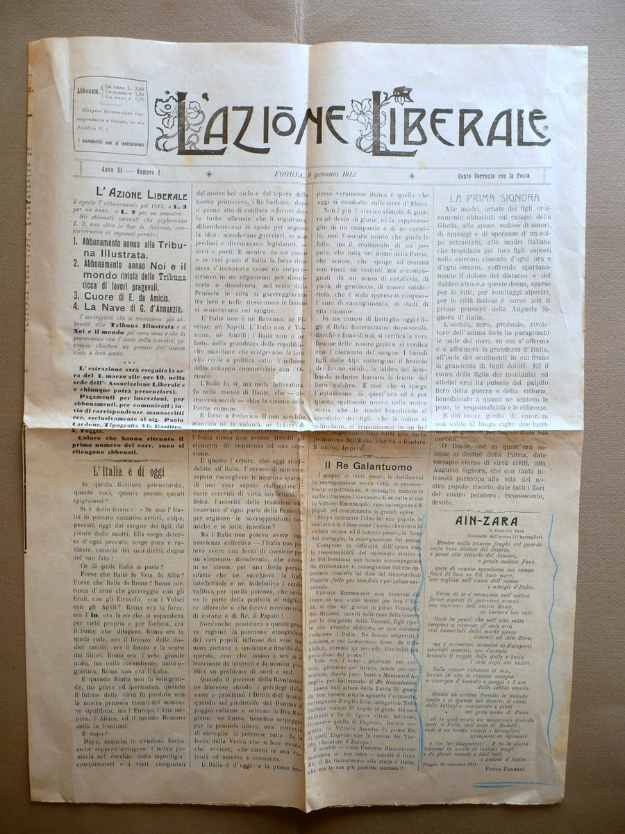 Rivista, Ain-Zara A Gustavo Fara, colonnello dell'eroico 11° bersaglieri" Poesia in prima pagina de "L' Azione Liberale" Anno XI - numero 2 Foggia, 9 gennaio 1912 Foggia 1912; cm 49,5x36; pp. 4 (bifolio); numero completo. Condizioni di conservazione Esemplare complessivamente in buono stato con tracce d'uso, normali pieghe di conservazione, qualche minima brunitura; poesia in prima pagina sopracitata evidenziata mediante due segni a pastello blu (vedi foto). Numero completo. SC03.D12656 N "
