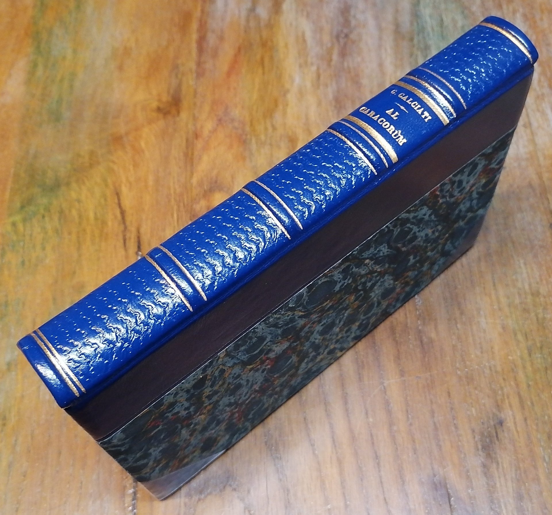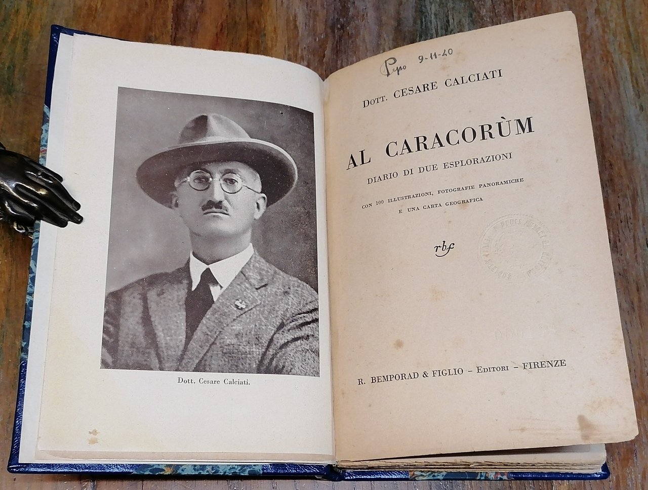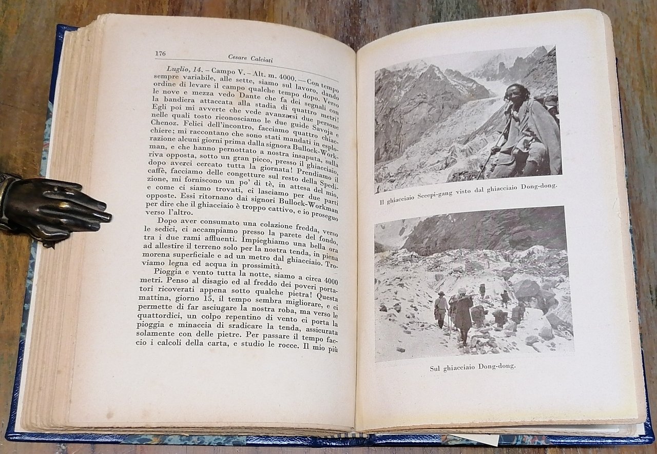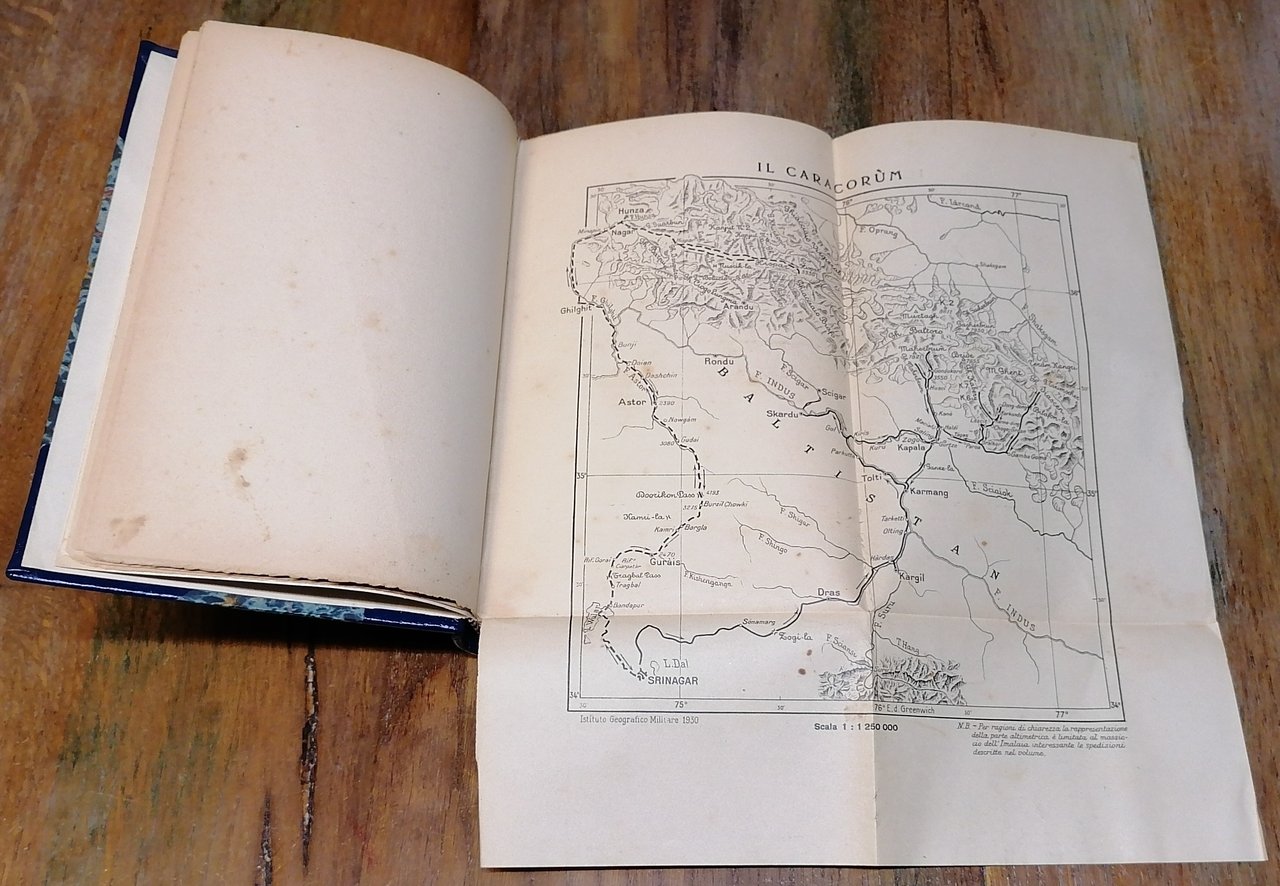 (Viaggi - Asia - Montagna - Himalaya - Karakorum) In 8°, legatura posteriore in mezza pelle blu con punte, dorso a sei nervi con titoli e filetti dorati e ricche impressioni a secco, carta marmorizzata policroma ai piatti, pp. (4),215,(5), un ritratto dell'autore in antiporta, una cartina geografica ripiegata, numerose tavole con immagini fotografiche in bianco e nero, 4 panorami più volte ripiegati fuori testo. Diario dei primi due viaggi di esplorazione nel Karakorum di Cesare Calciati, topografo e naturalista nelle spedizioni dei coniugi americani Bullock-Workman (1908 e 1911), pubblicato postumo dalla moglie Giuseppina Anguissola Scotti. Piccola firma di appartenenza con data al bordo superiore del frontespizio. Alcune lievi, ininfluenti tracce di ossidazione all' interno ma volume solido e ben conservato.