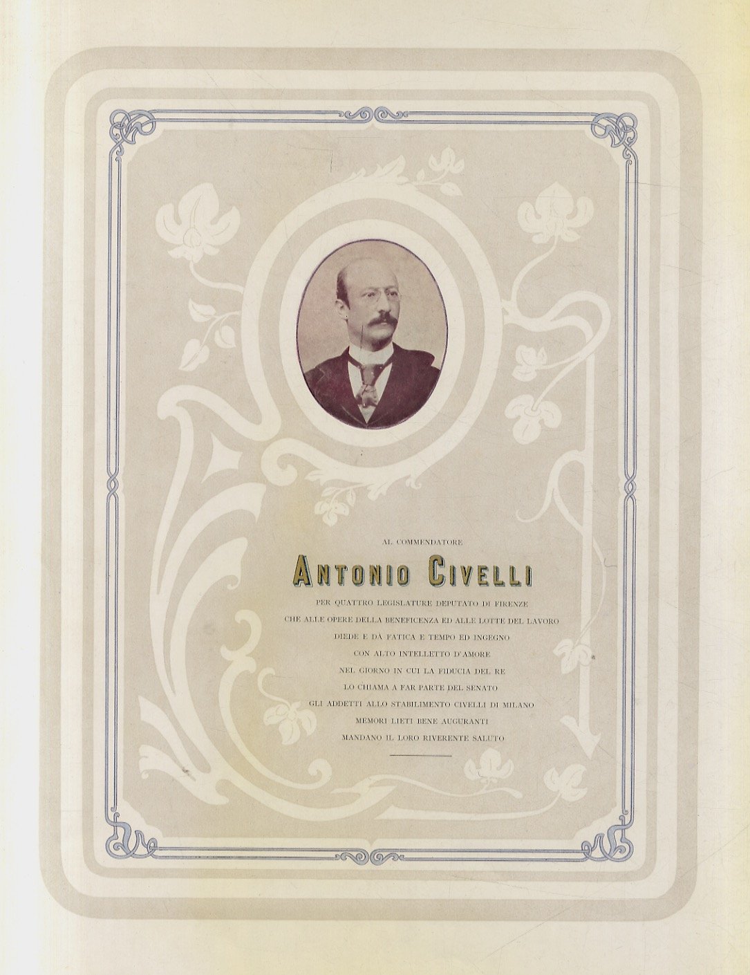 AL Commendatore Antonio Civelli per quattro legislature deputato di Firenze che alle opere delle beneficenza ed alle lotte del lavoro diede e da fatica e tempo ed ingegno con alto intelletto d'amore nel giorno in cui la fiducia del Re lo chiama a far parte del Senato gli addetti allo stabilimento Civelli di Milano, memori, lieti, beneauguranti, mandano il loro riverente saluto.
