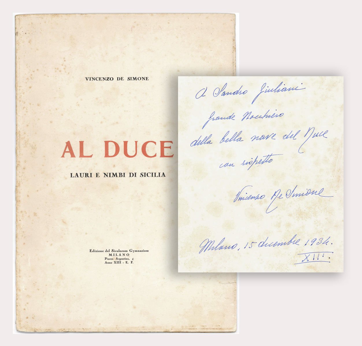 LIBRO Edizione originale. CON AUTOGRAFO. Esemplare in stato più che buono (brossura fiorita e con piccolo strappo al piatto anteriore; prima e ultime carte fiorite, per il resto pulite). Contiene pagina di giornale con fotografia del redattore capo di «Il Popolo d’Italia» Sandro Giuliani. Dedica autografa dell’autore allo stesso Giuliani all’antiporta. Estremamente raro. Opera del 1934 del poeta Vincenzo De Simone a commemorazione dei sansepolcristi siciliani, ricordati con fotografie accompagnate da poesie dell’autore. Come riportato nel volume: «Con la presente pubblicazione l’Editore inizia per gruppi regionali una documentazione storico-biografica dei Sansepolcristi e dei fedelissimi della vigilia della Rivoluzione Fascista».