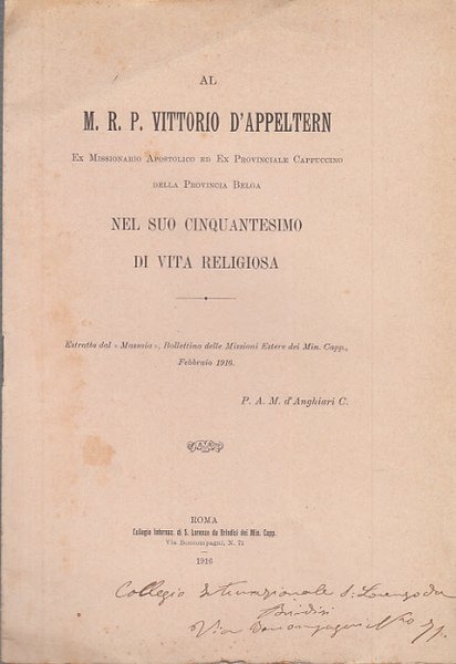 Al M.r.p. Vittorio D'appeltern Ex Missionario Apostolico Ed Ex Provinciale Cappuccino Della Provincia Belga Nel Suo Cinquantesimo Di Vita Religiosa